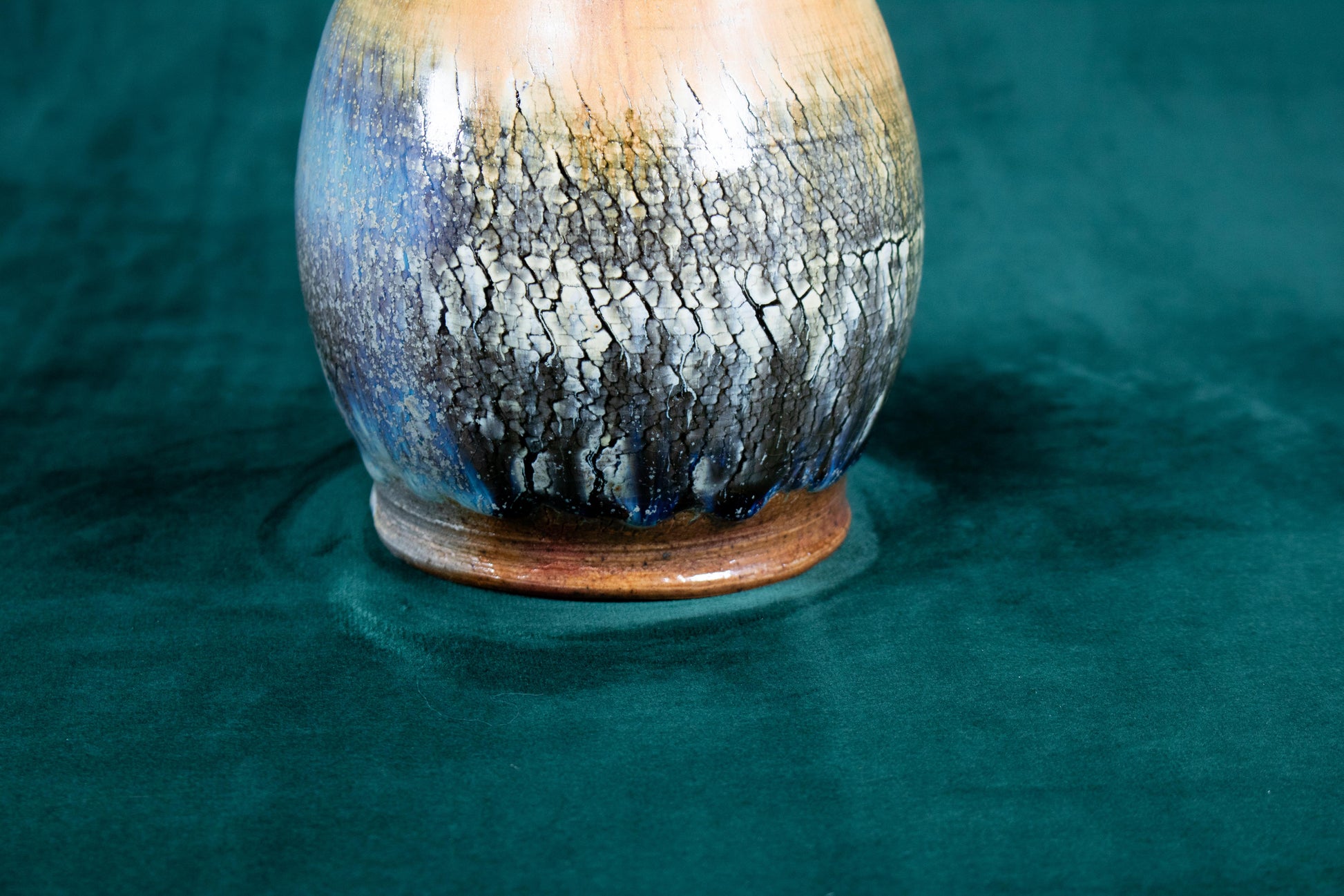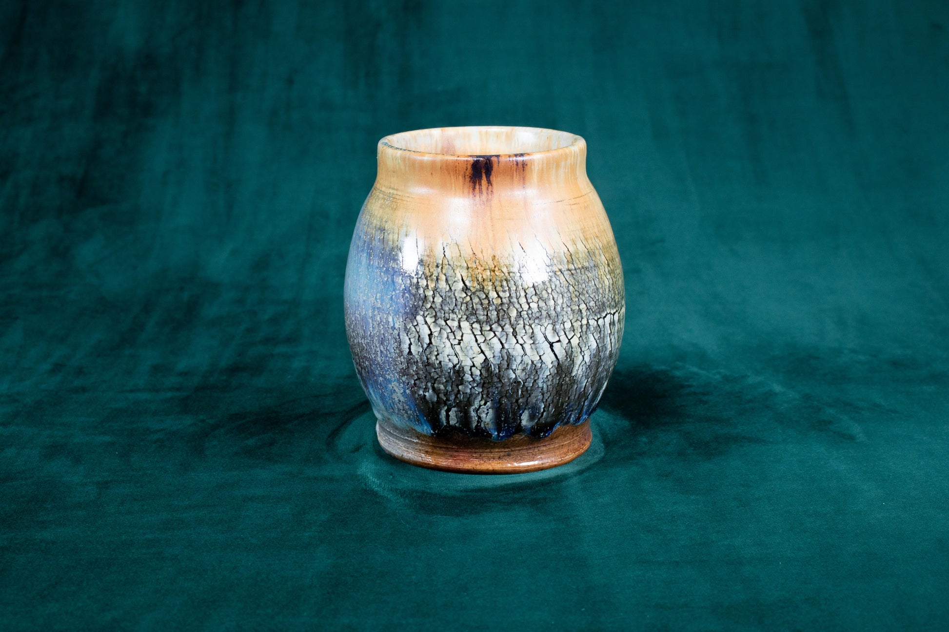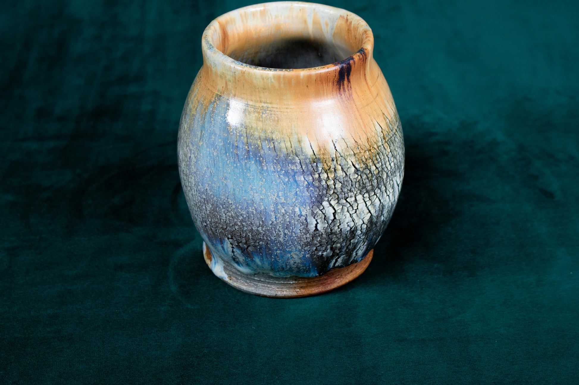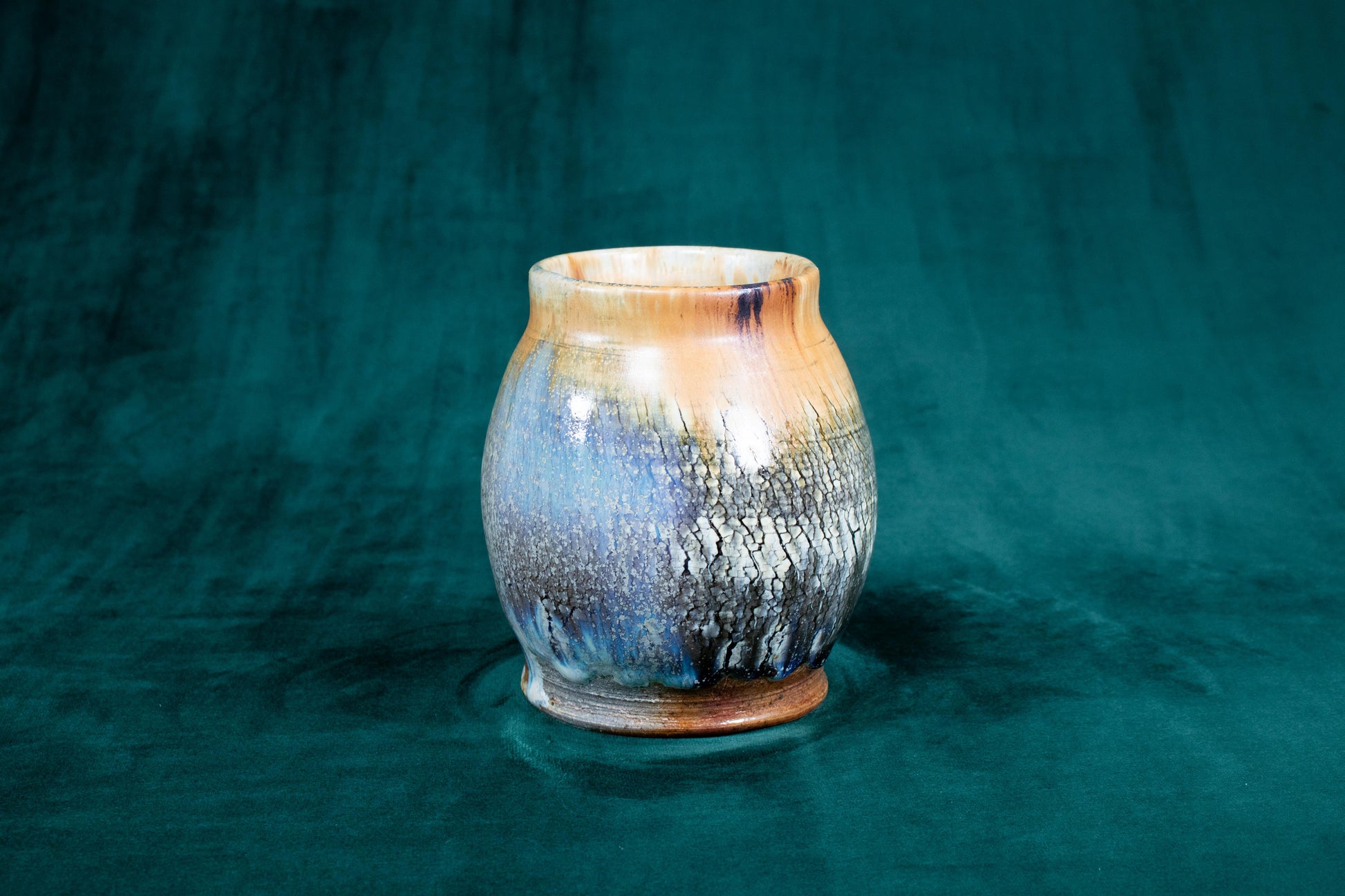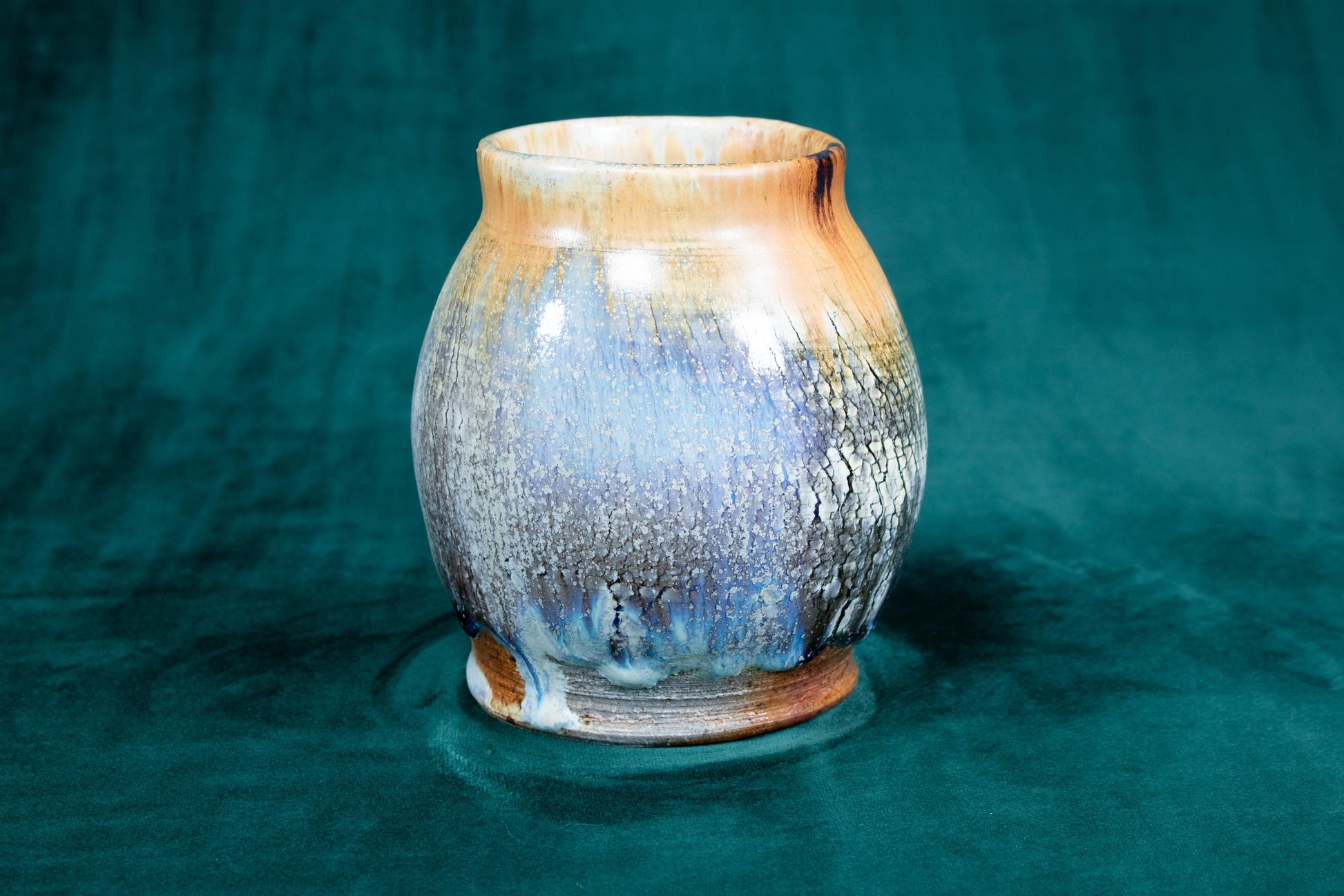 This vase was thrown on a wheel, trimmed, sculpted, fired in a kiln, hand glazed for gloss, and fired in a wood fire kiln for 45 hours to 2300°F for final product.