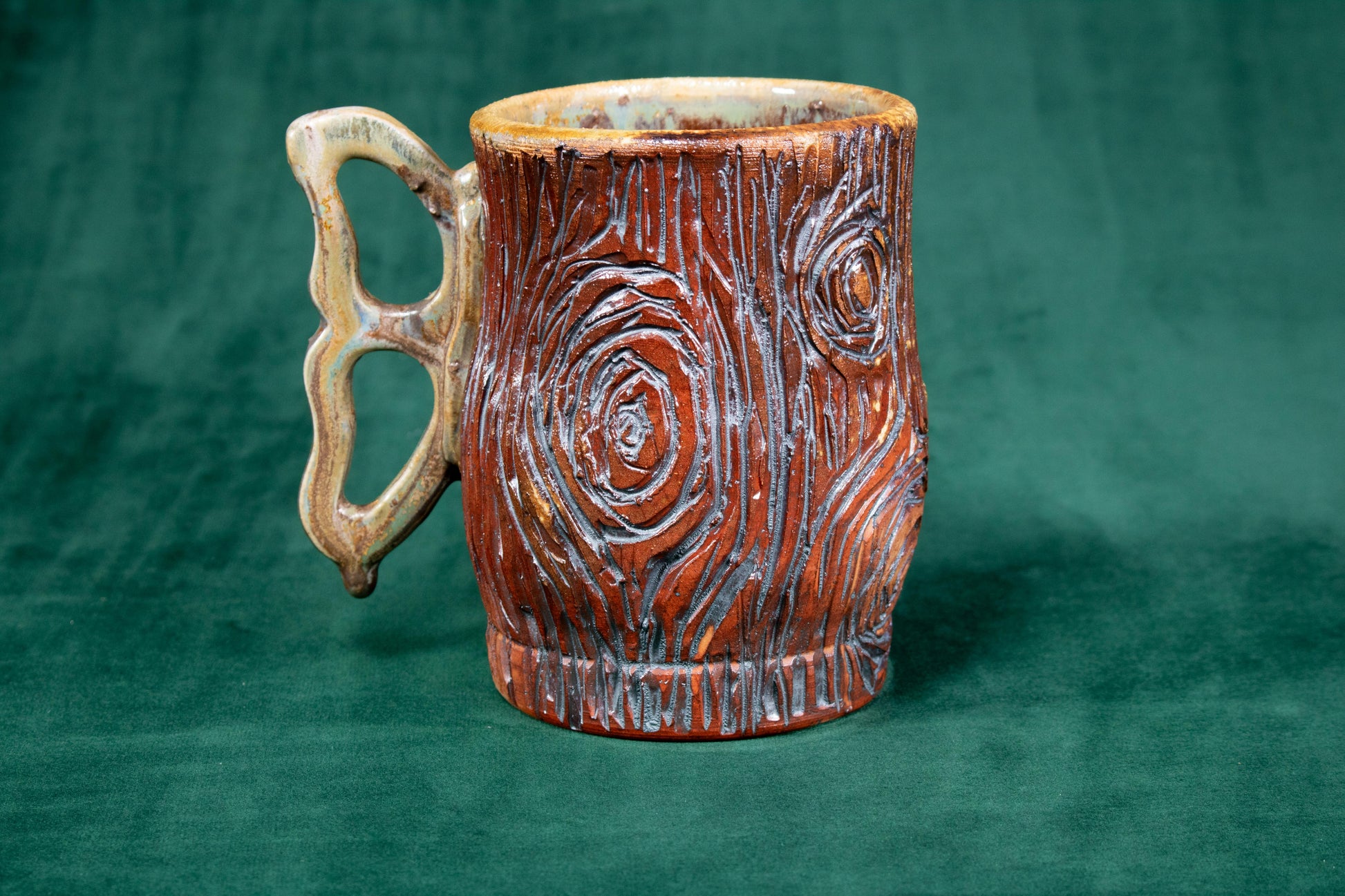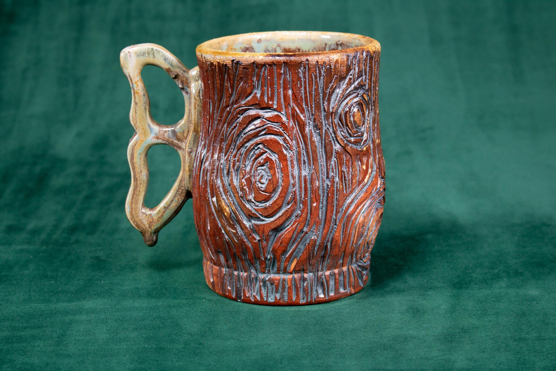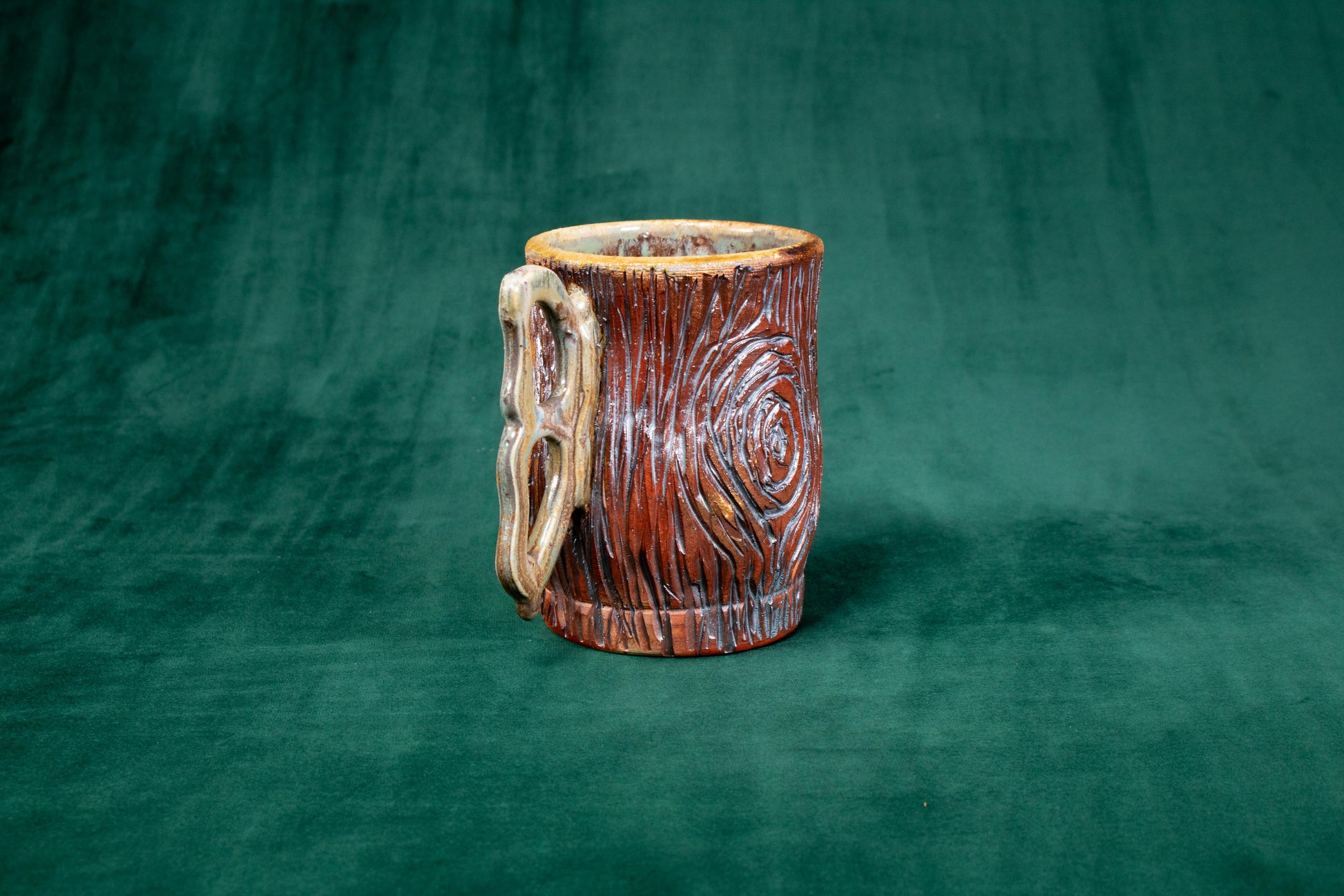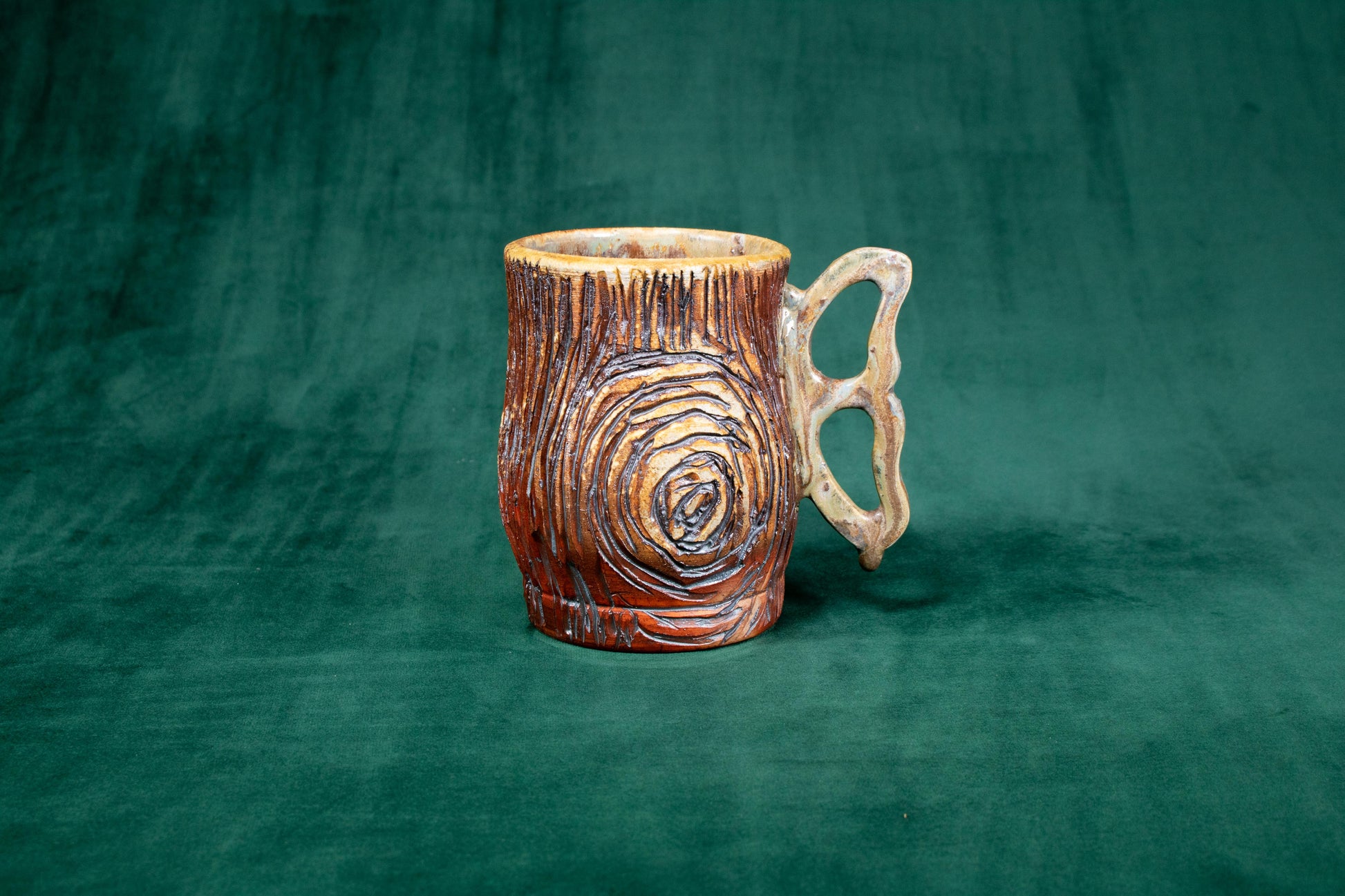 This mug was thrown on a wheel, trimmed, carved, sculpted, fired in a kiln, hand glazed for gloss, and fired in a wood fire kiln for 45 hours to 2300 °F for final product.