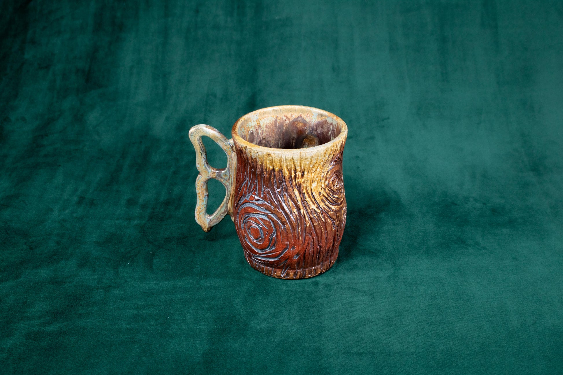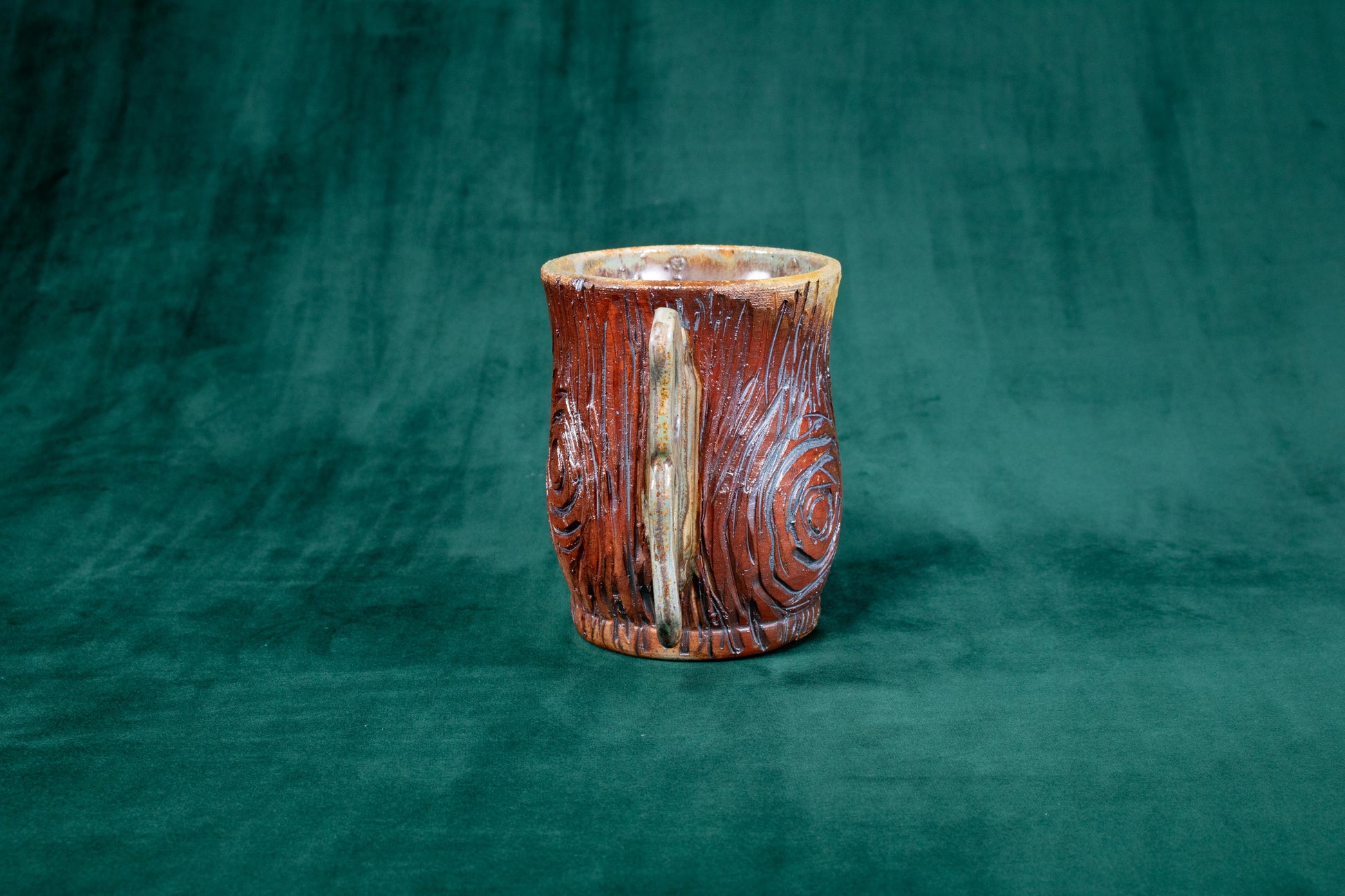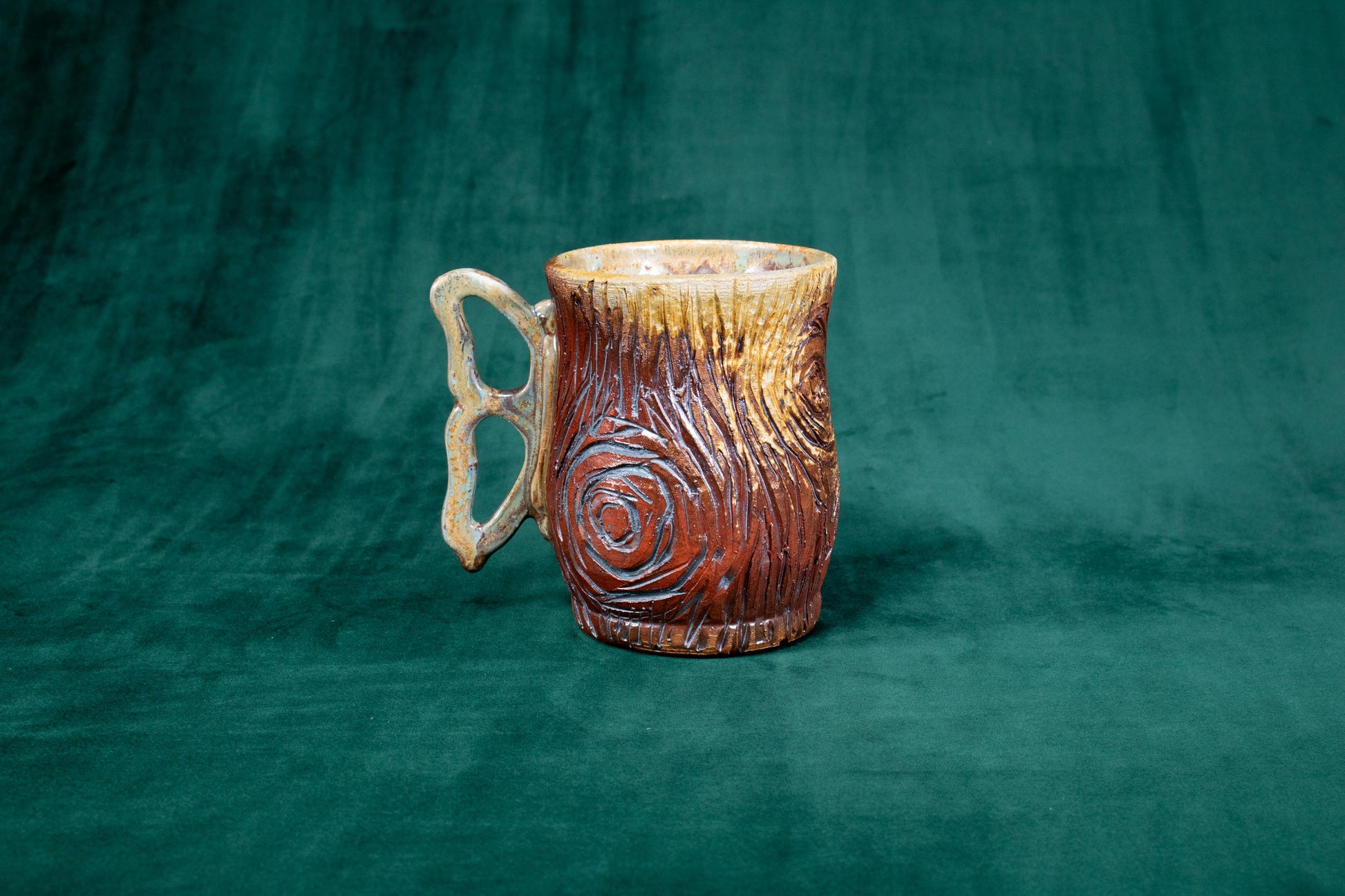 This mug was thrown on a wheel, trimmed, carved, sculpted, fired in a kiln, hand glazed for gloss, and fired in a wood fire kiln for 45 hours to 2300 degrees°F for final product.