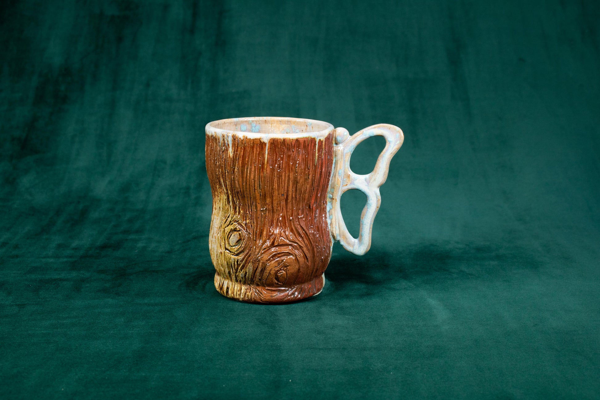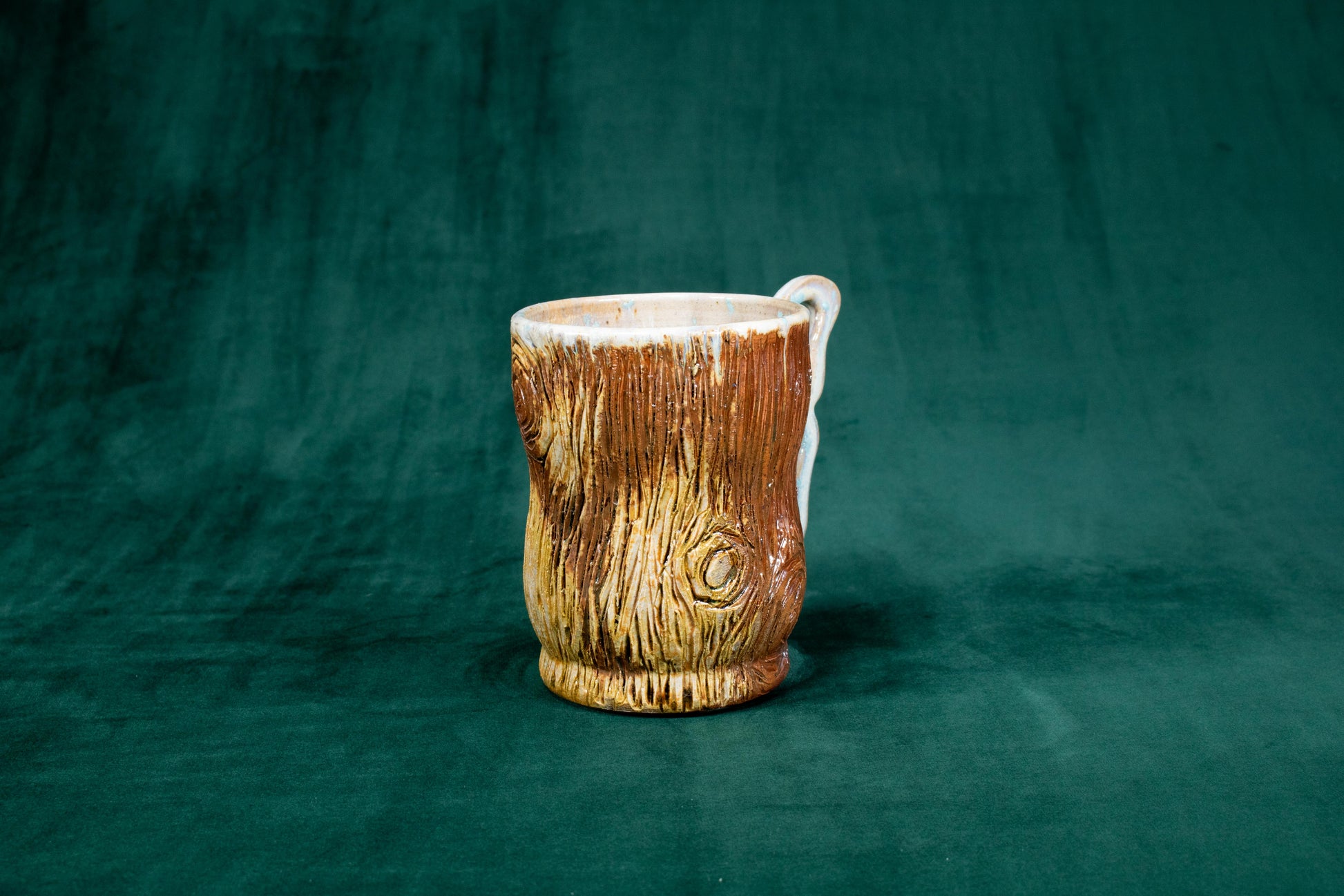 This mug was thrown on a wheel, trimmed, carved, sculpted, fired in a kiln, hand glazed for gloss, and fired in a wood fire kiln for 45 hours to 2300°F for final product.