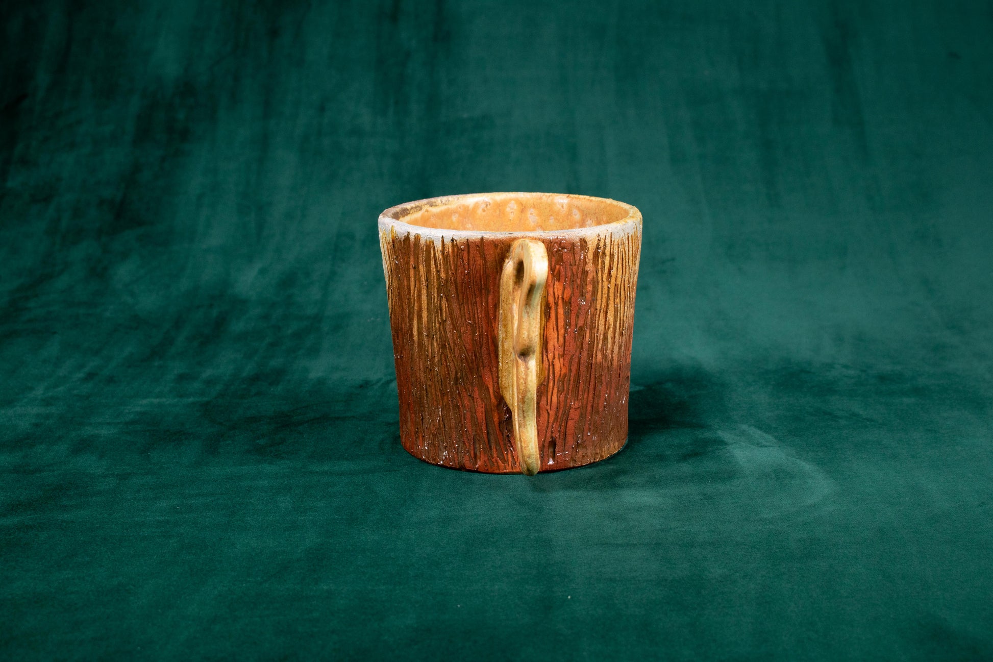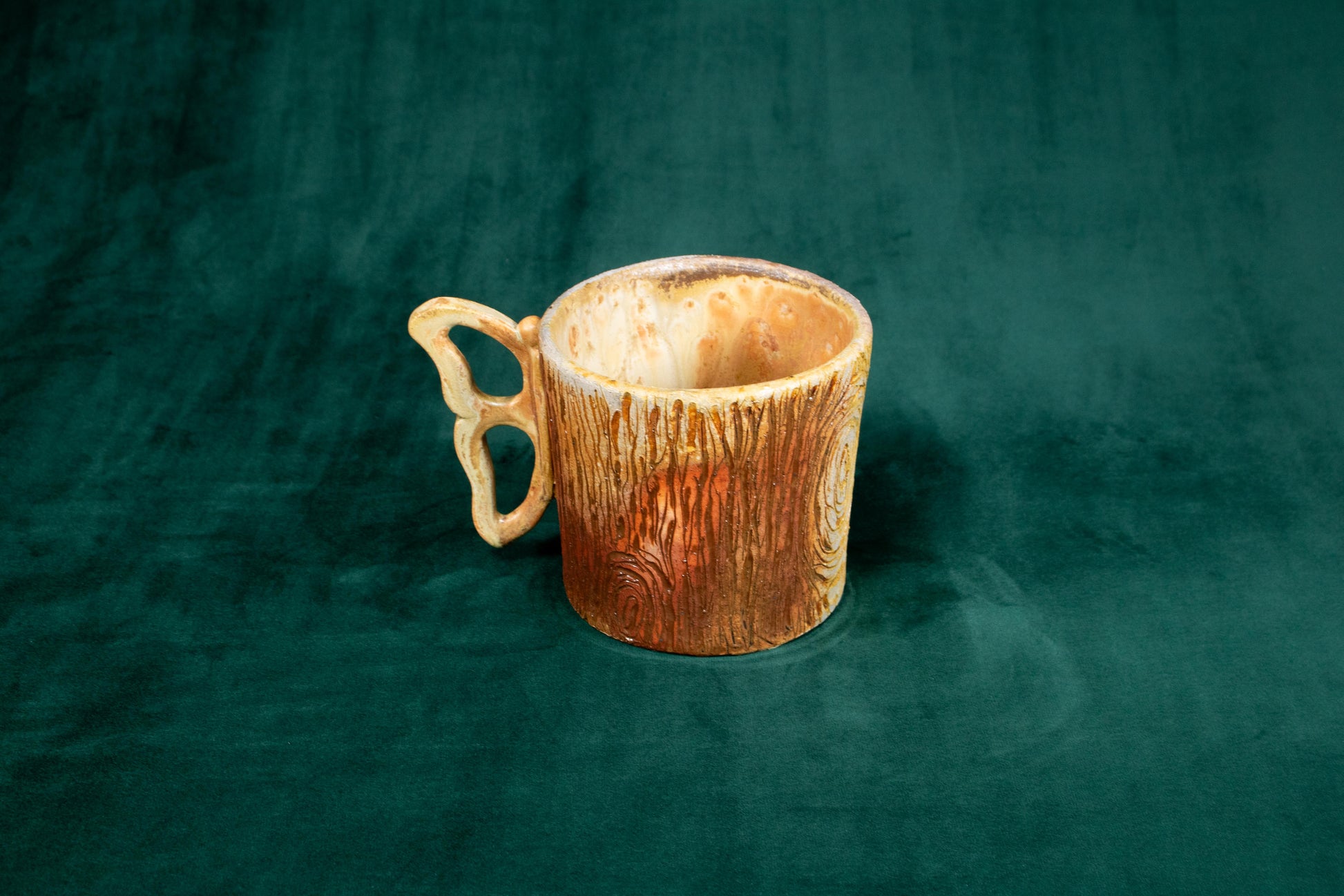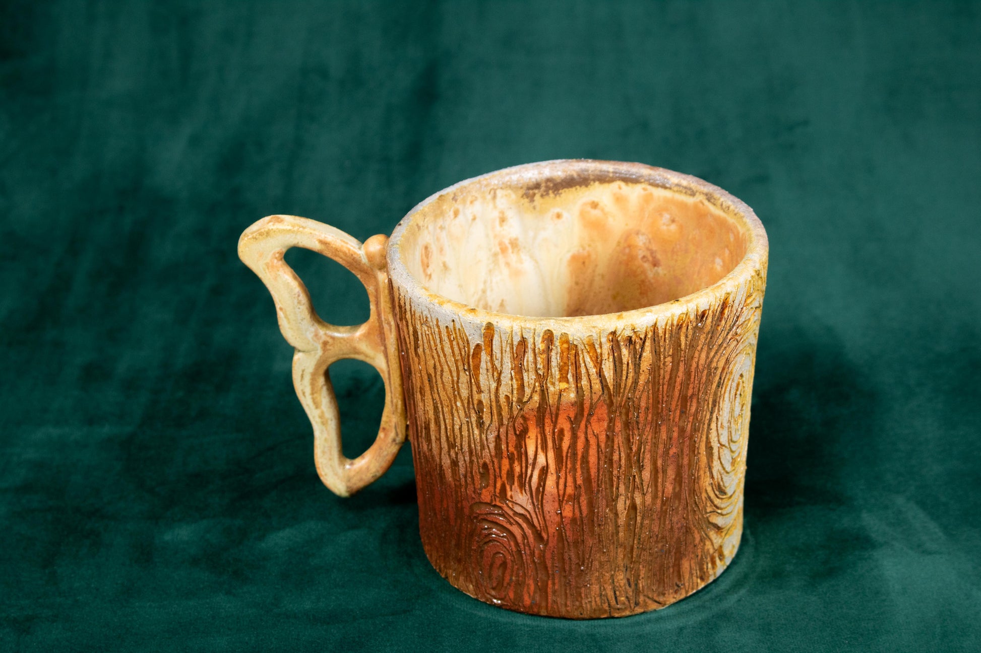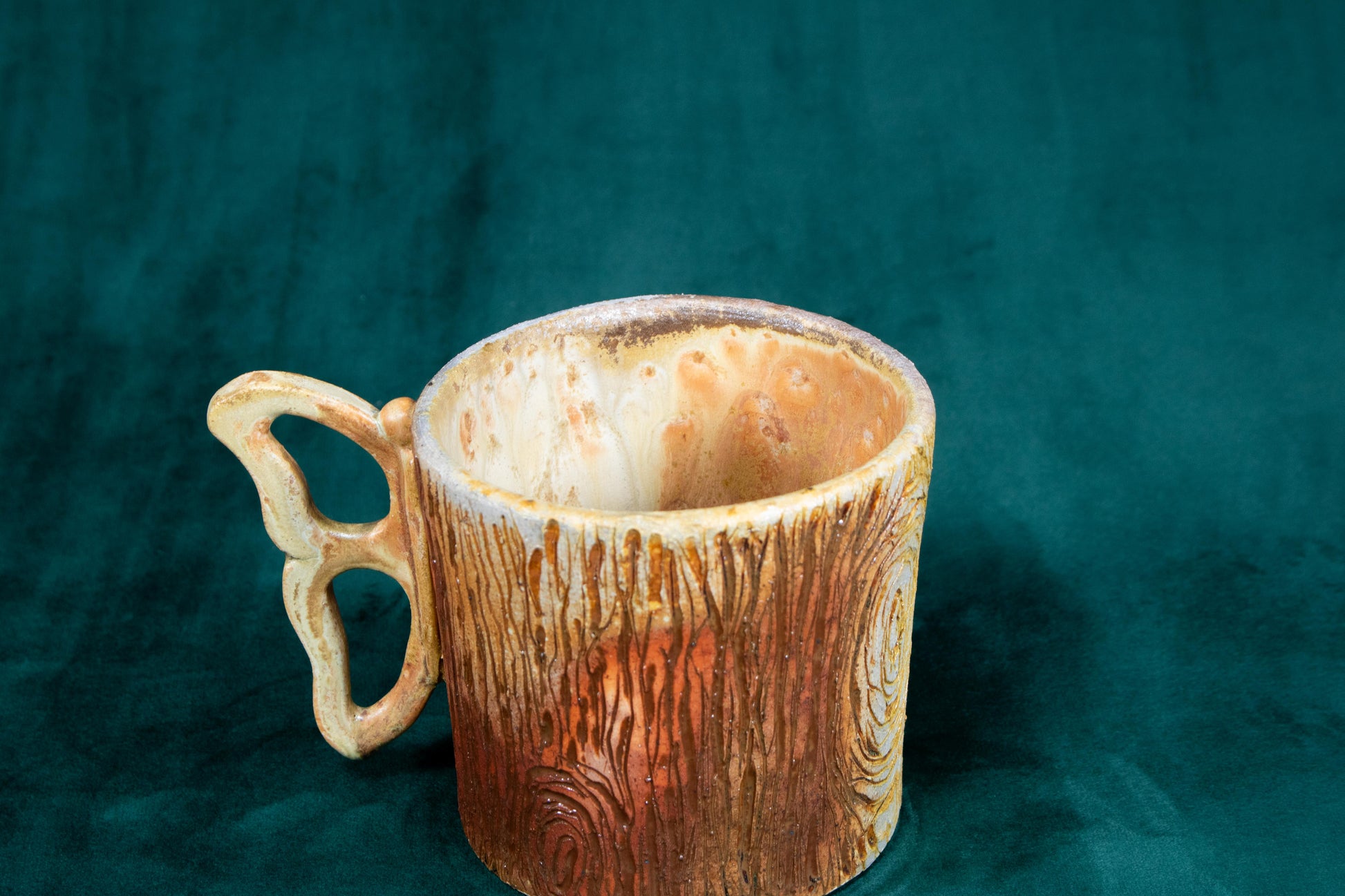 This mug was thrown on a wheel, trimmed, carved, sculpted, fired in a kiln, hand glazed for gloss, and fired in a wood fire kiln for 45 hours to 2300°F for final product.