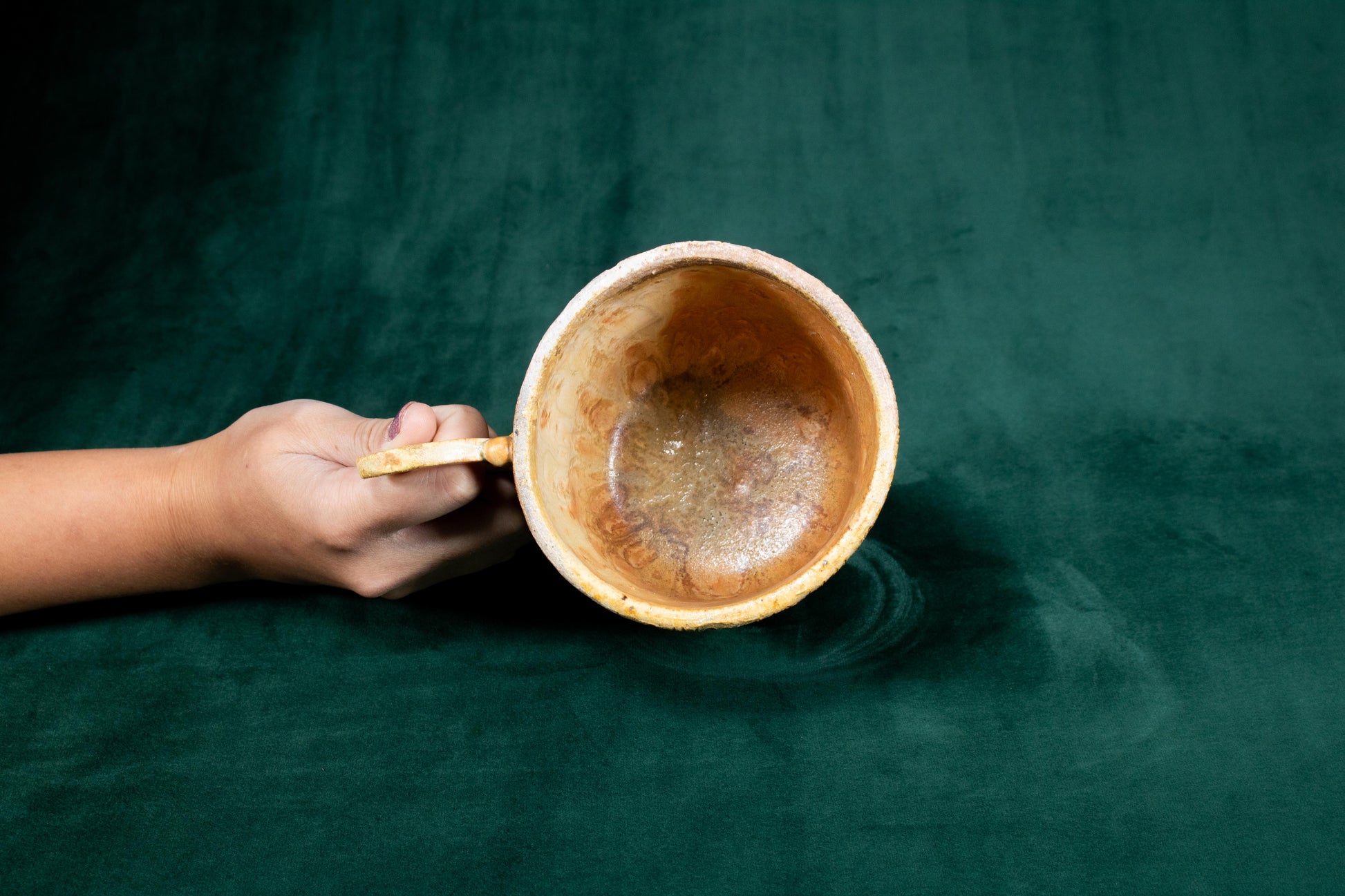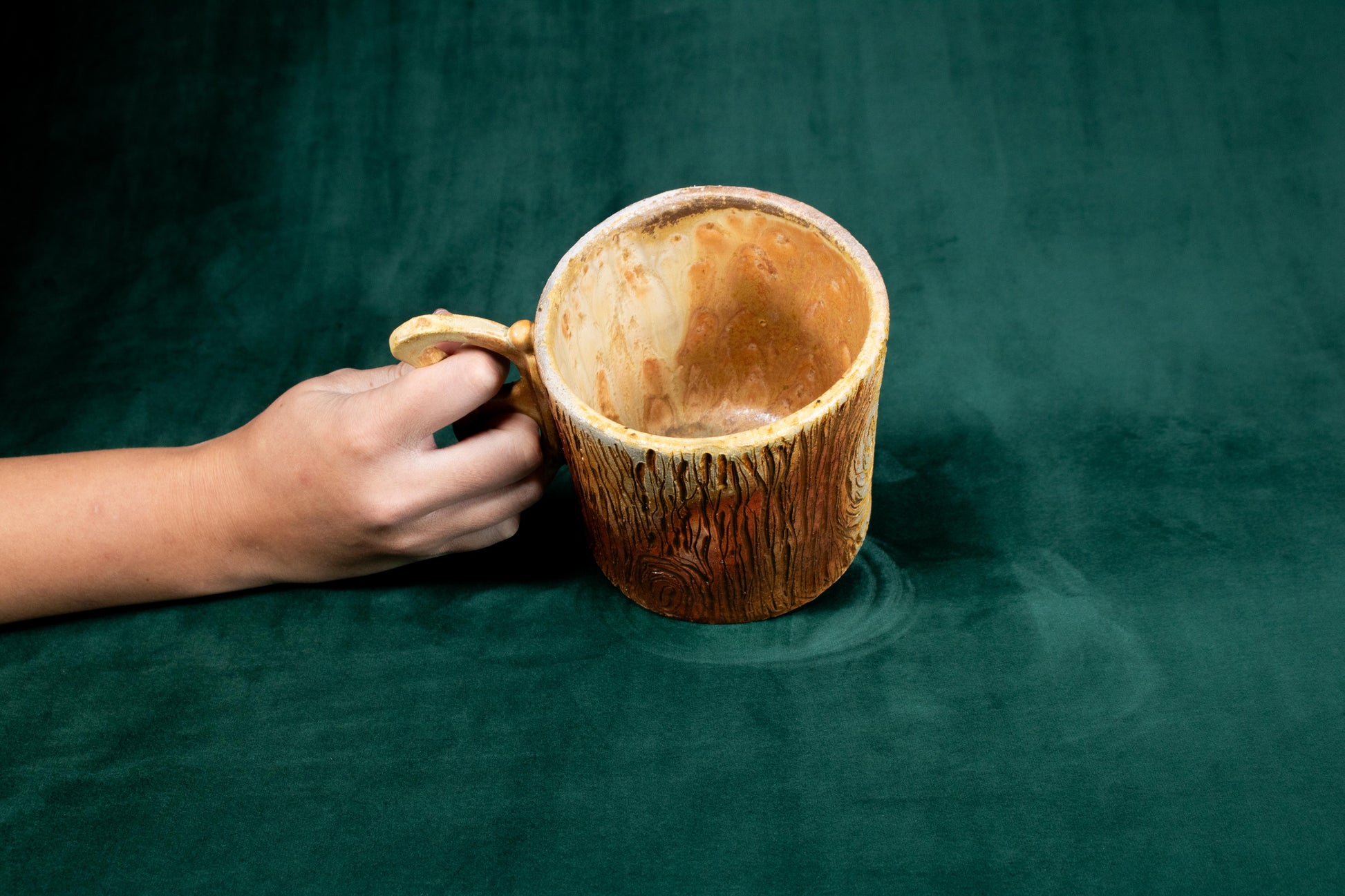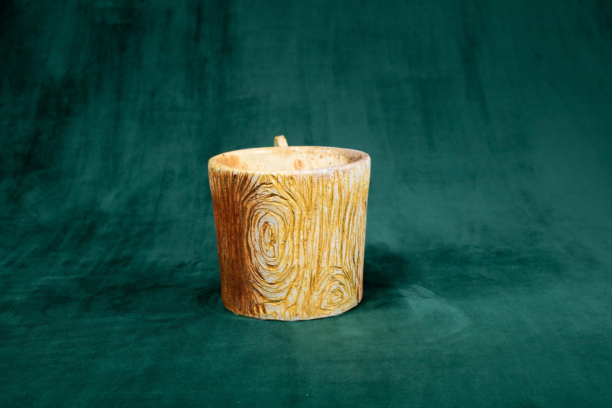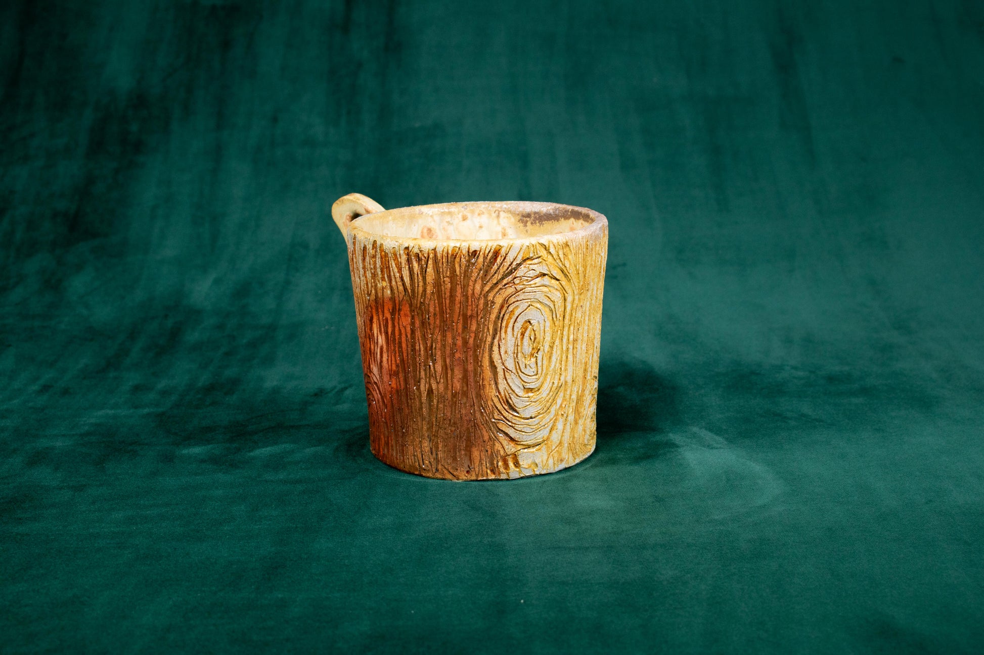 This mug was thrown on a wheel, trimmed, carved, sculpted, fired in a kiln, hand glazed for gloss, and fired in a wood fire kiln for 45 hours to 2300°F for final product.