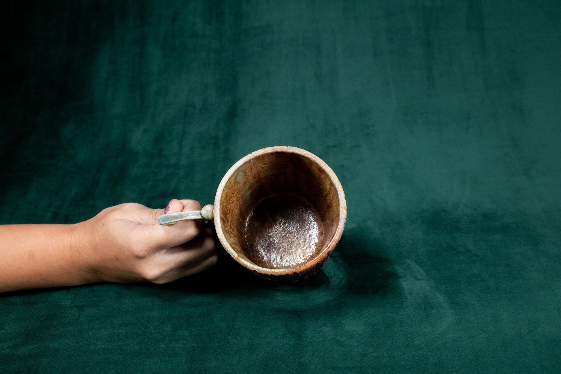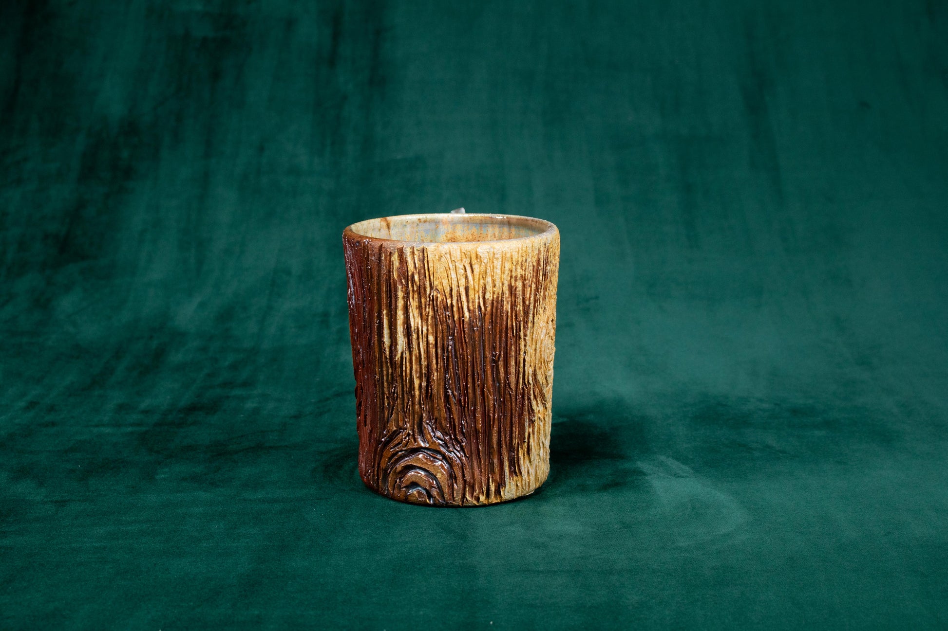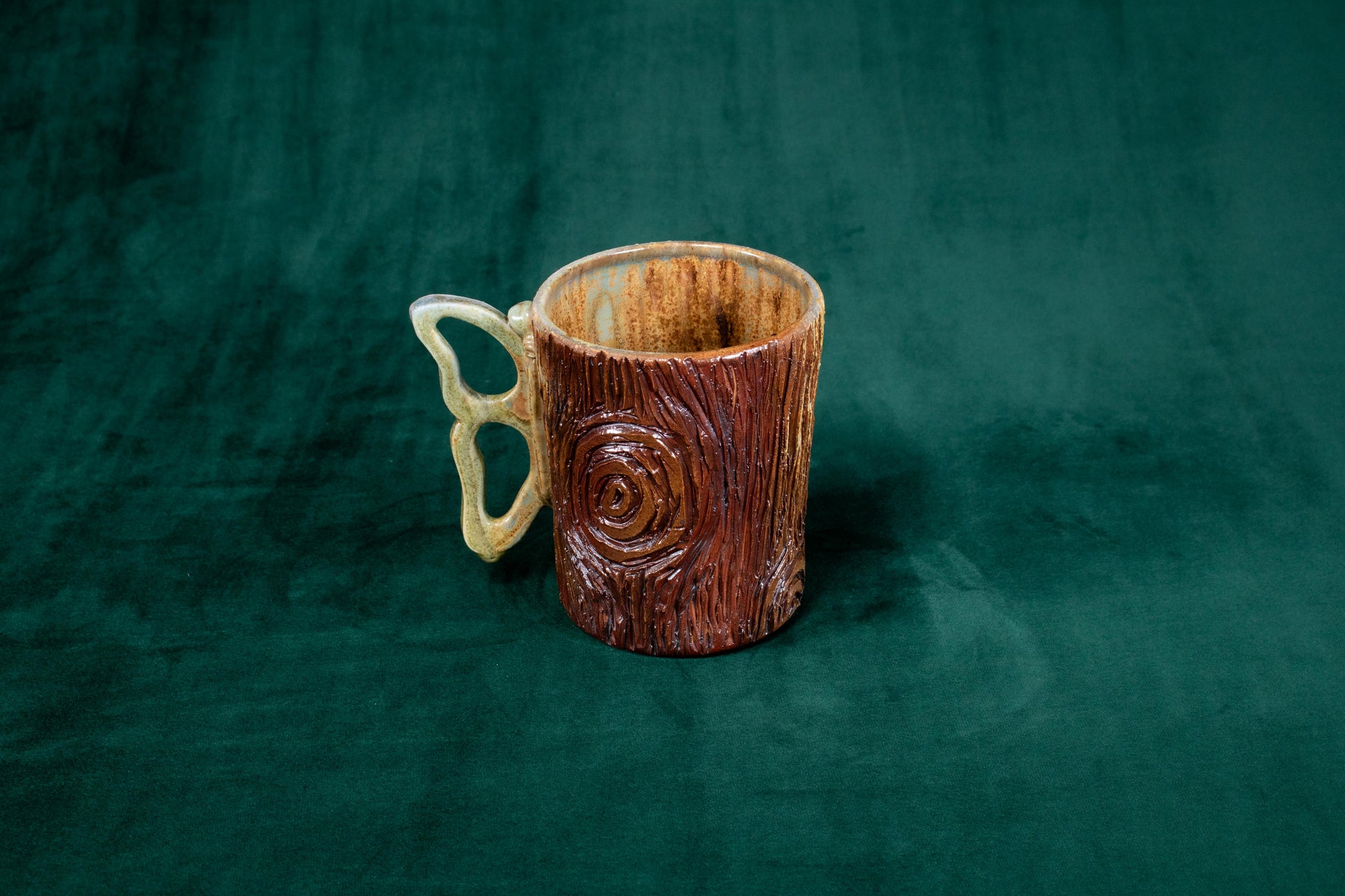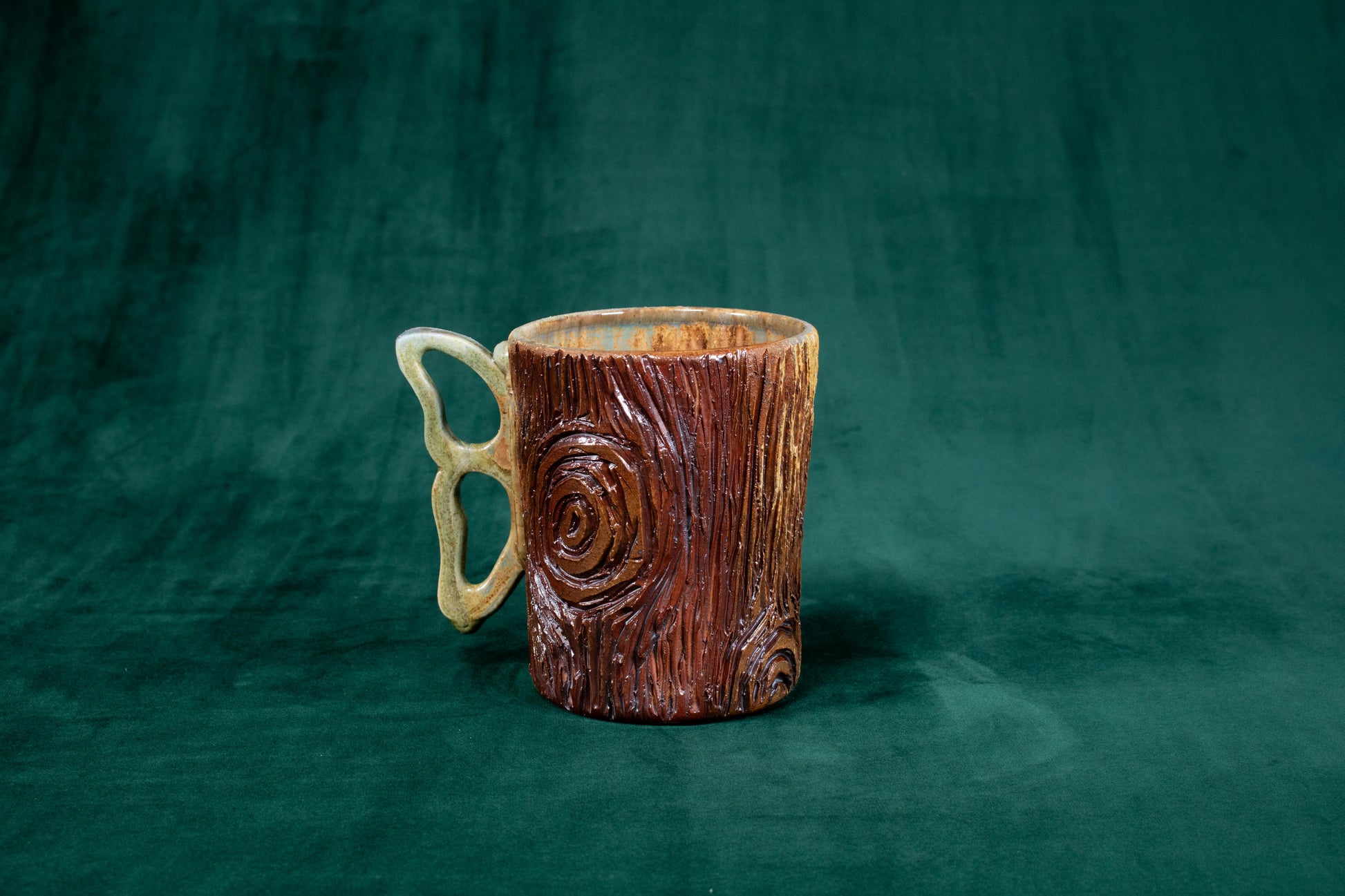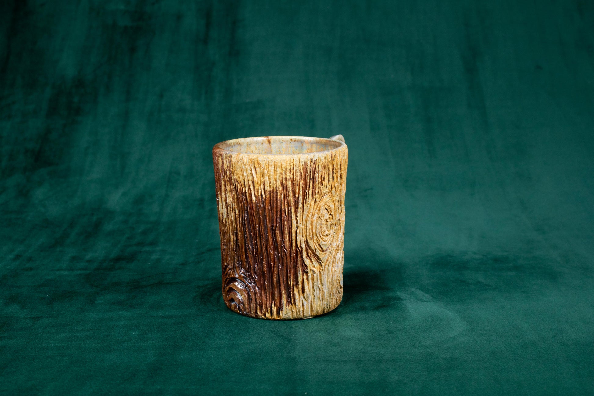 This mug was thrown on a wheel, trimmed, carved, sculpted, fired in a kiln, hand glazed for gloss, and fired in a wood fire kiln for 45 hours to 2300°F for final product.