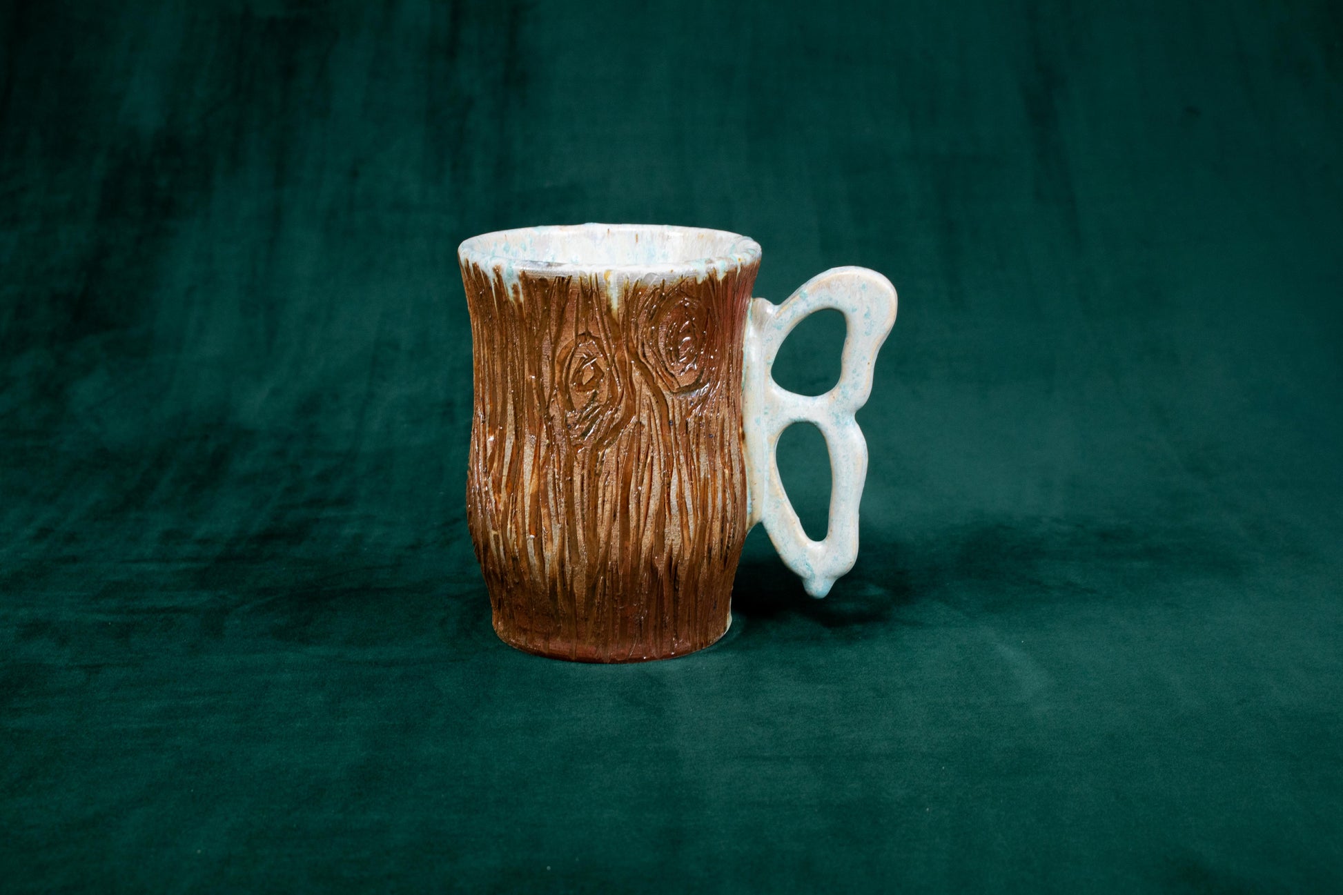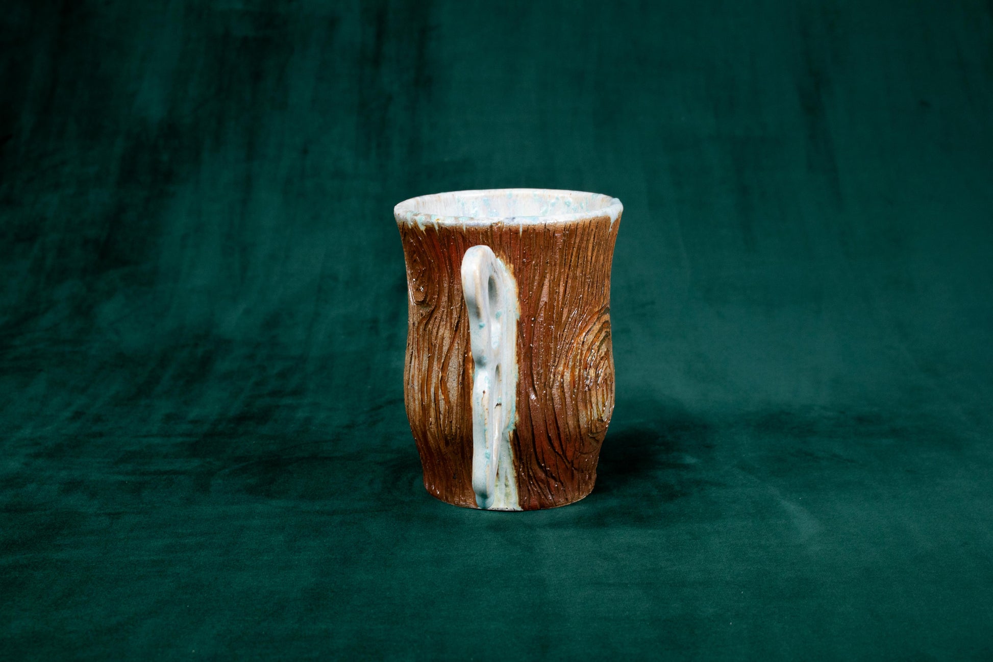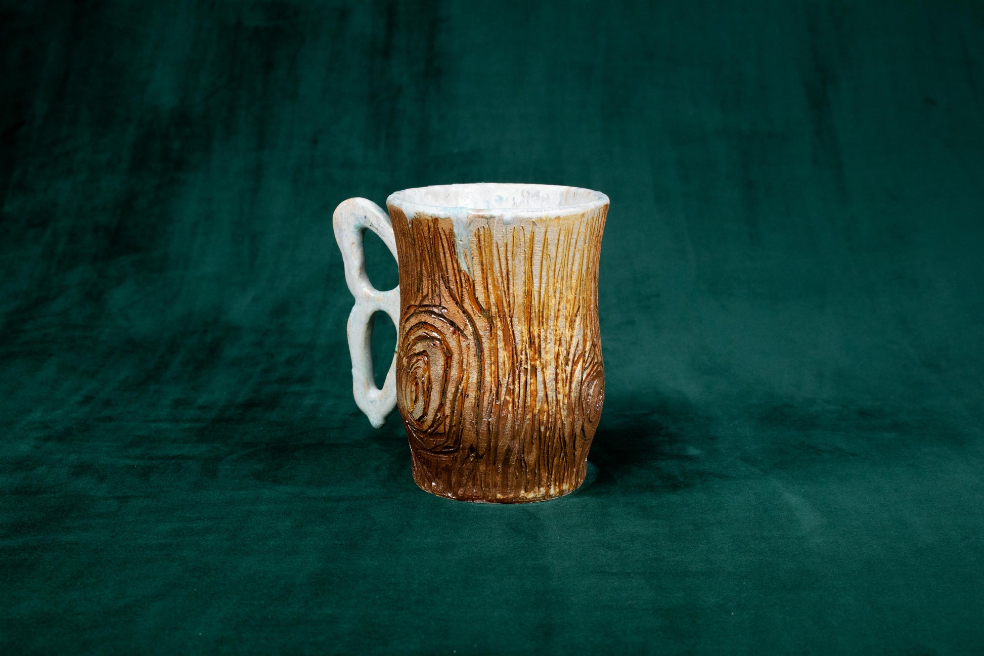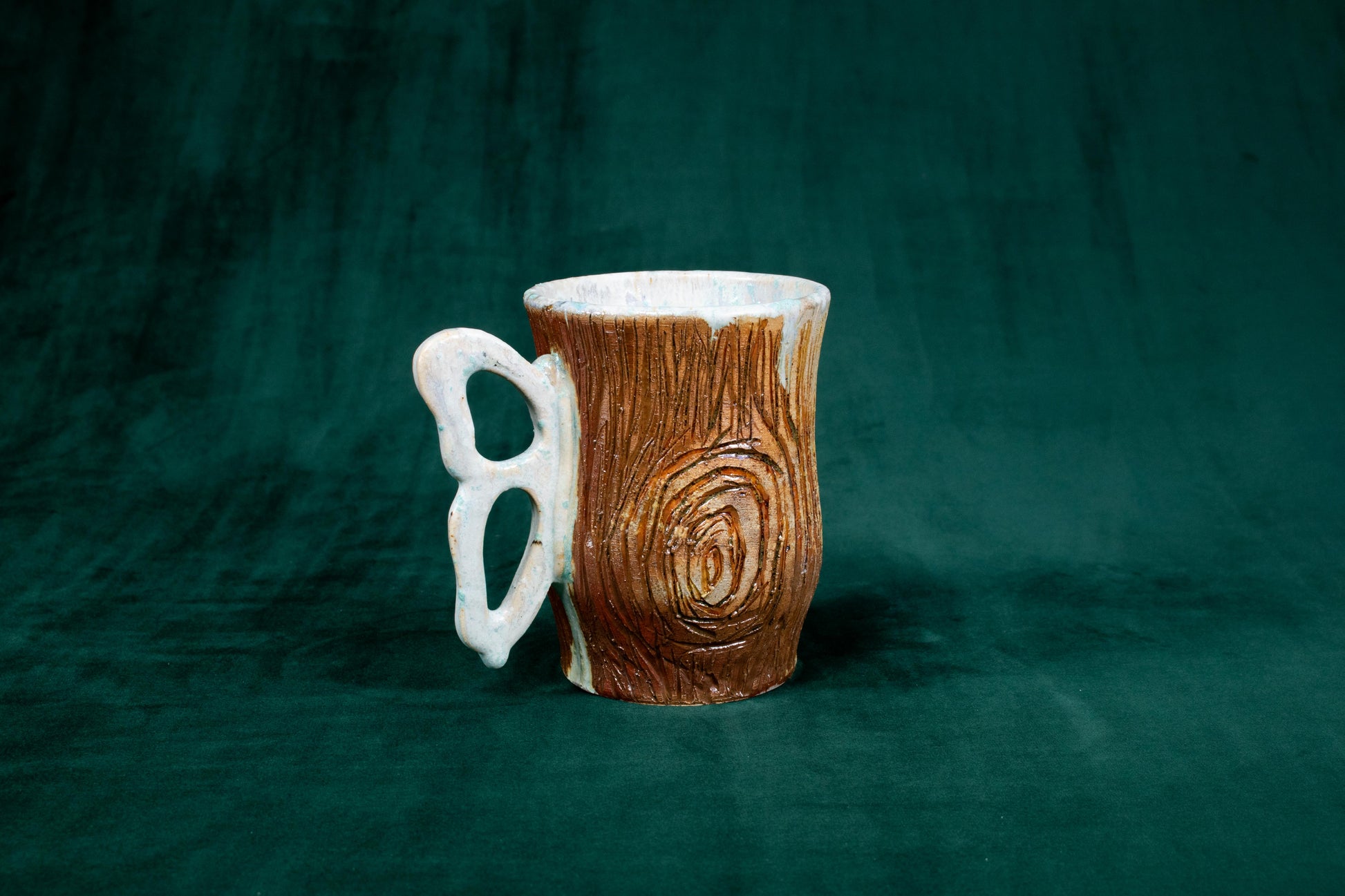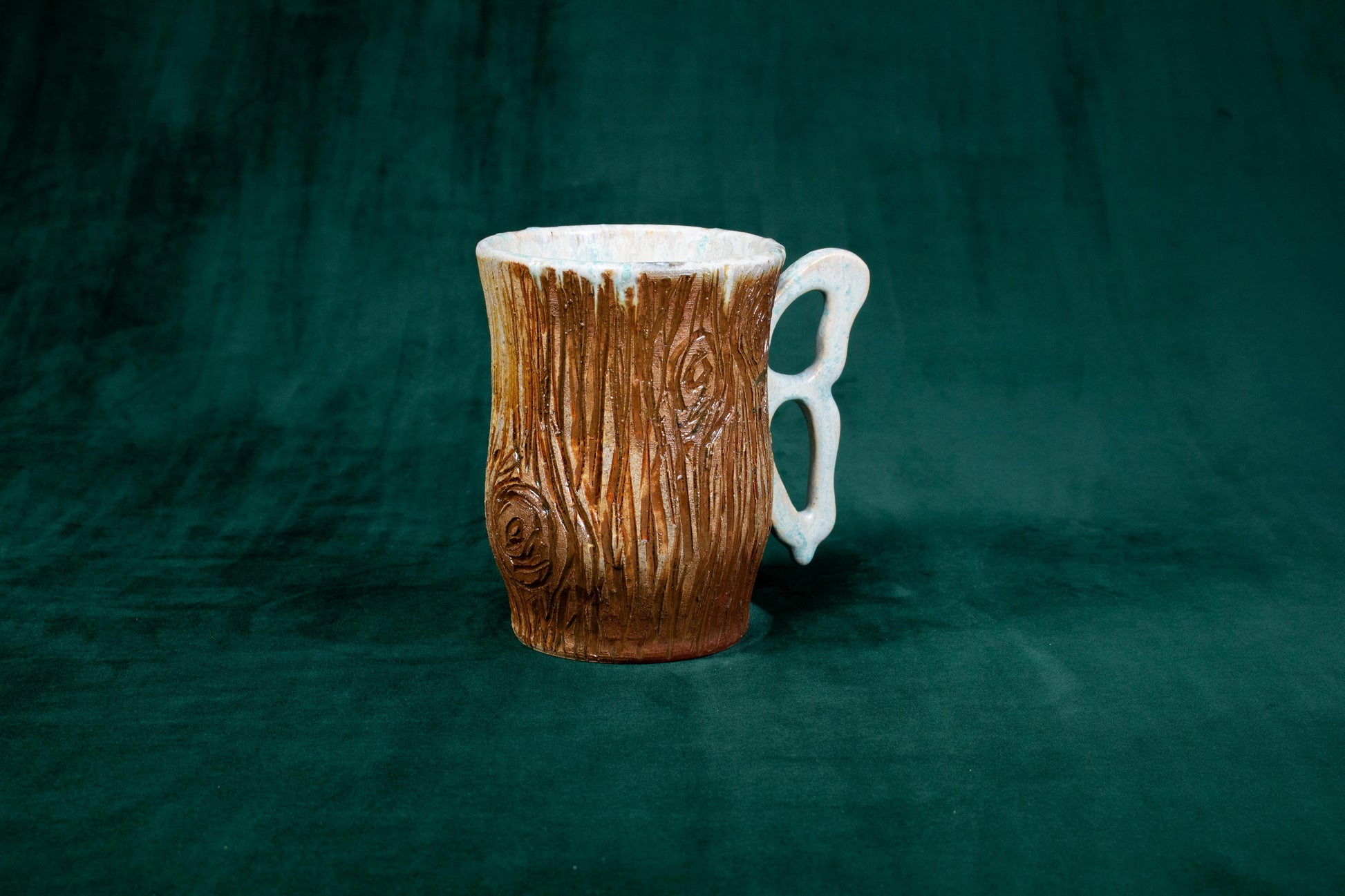 This mug was thrown on a wheel, trimmed, carved, sculpted, fired in a kiln, hand glazed for gloss, and fired in a wood fire kiln for 45 hours to 2300°F for final product.