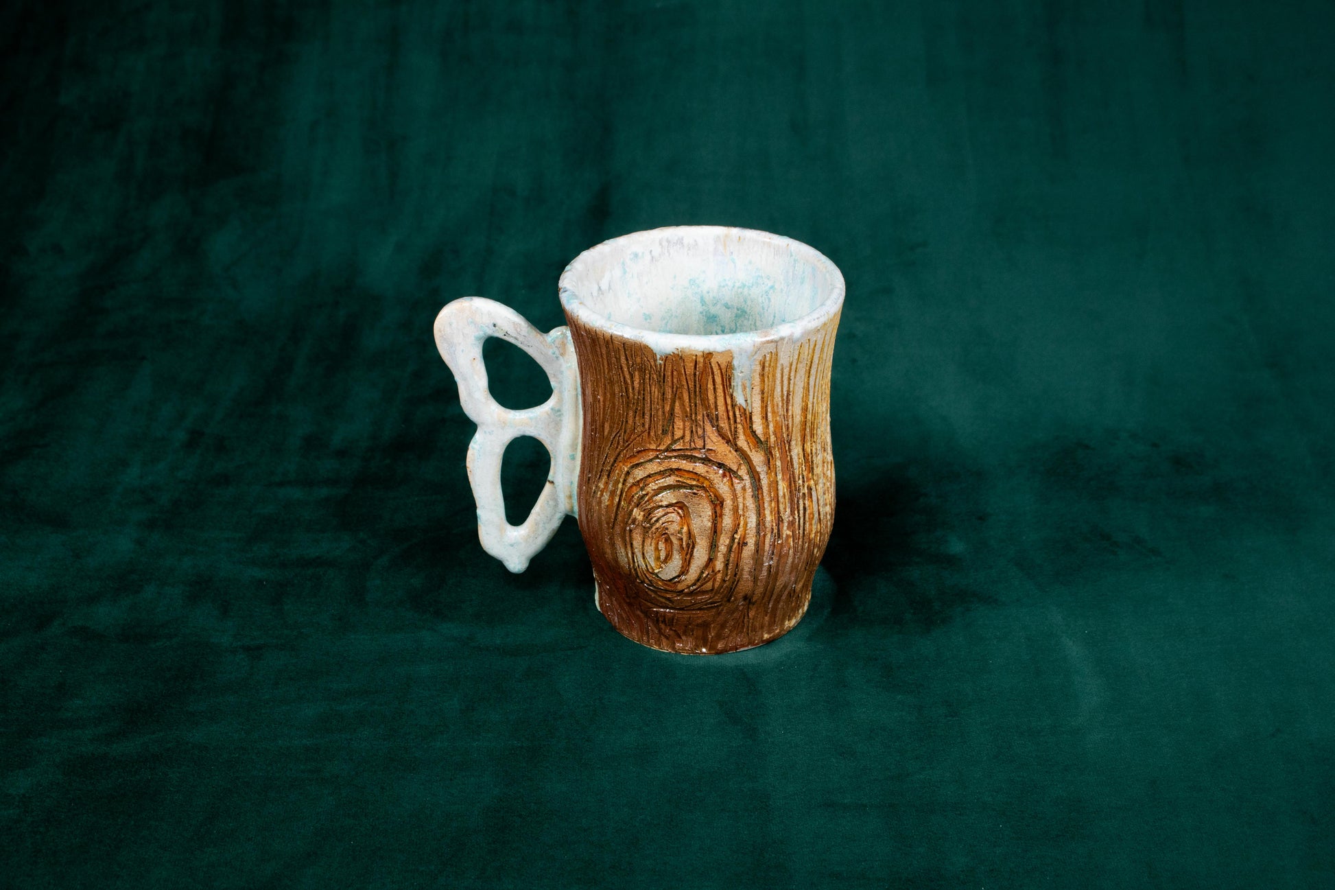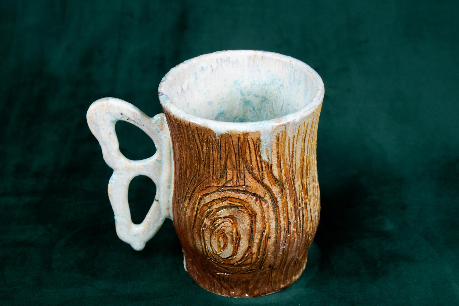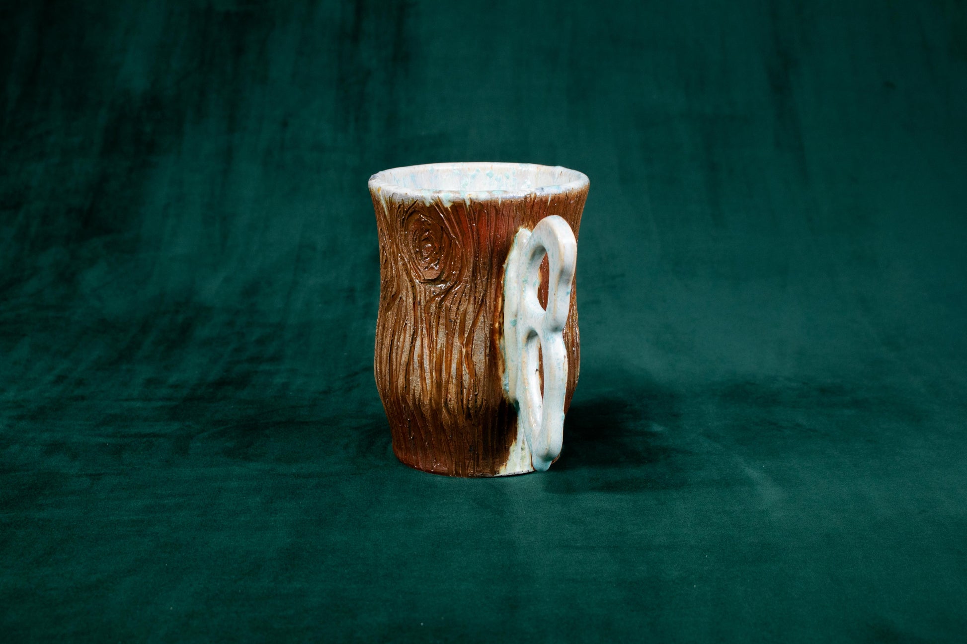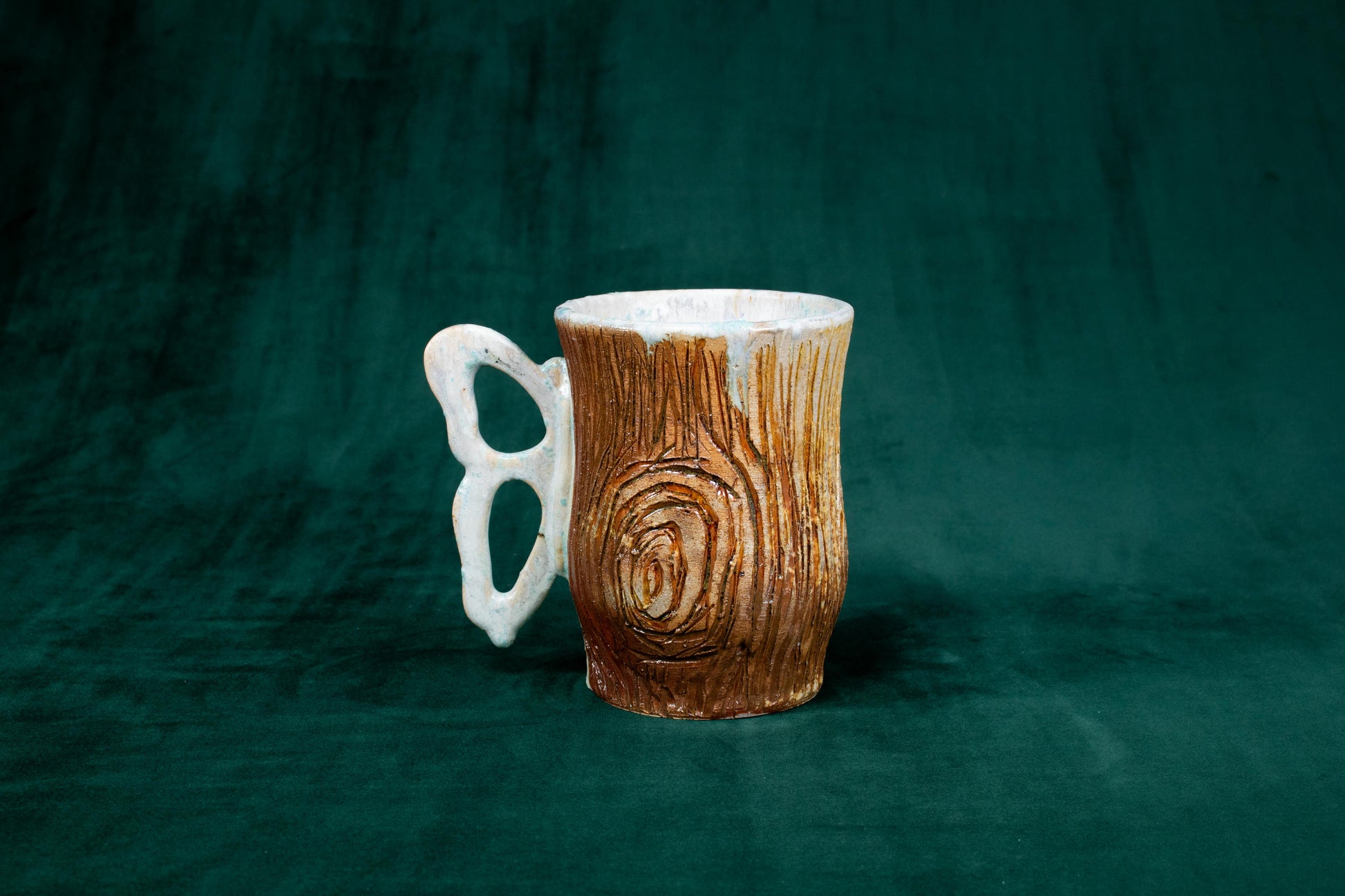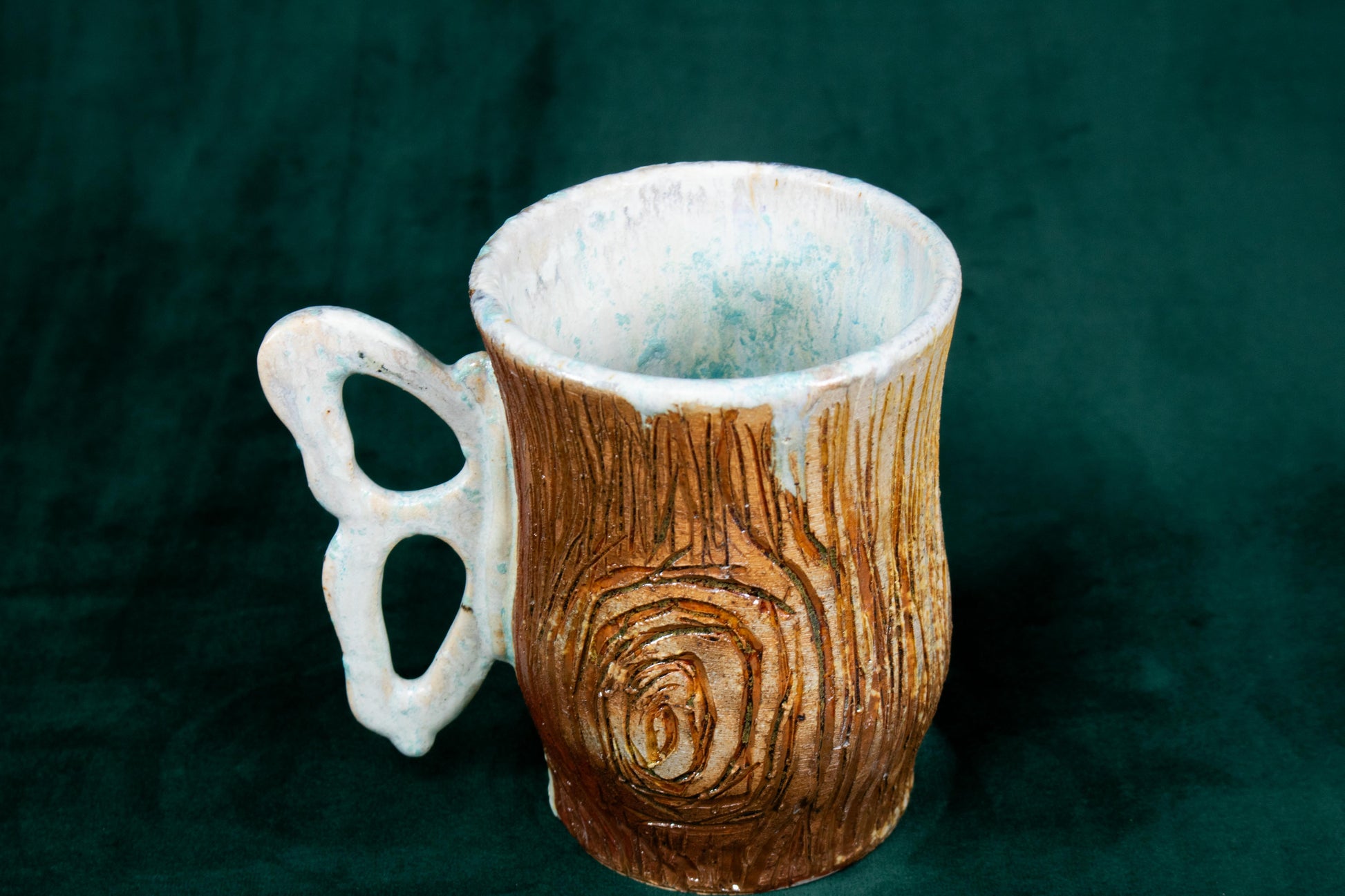 This mug was thrown on a wheel, trimmed, carved, sculpted, fired in a kiln, hand glazed for gloss, and fired in a wood fire kiln for 45 hours to 2300°F for final product.