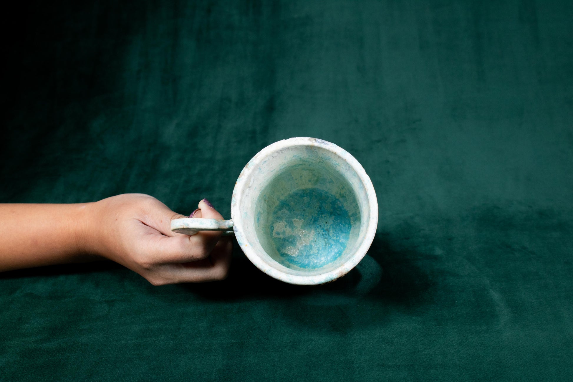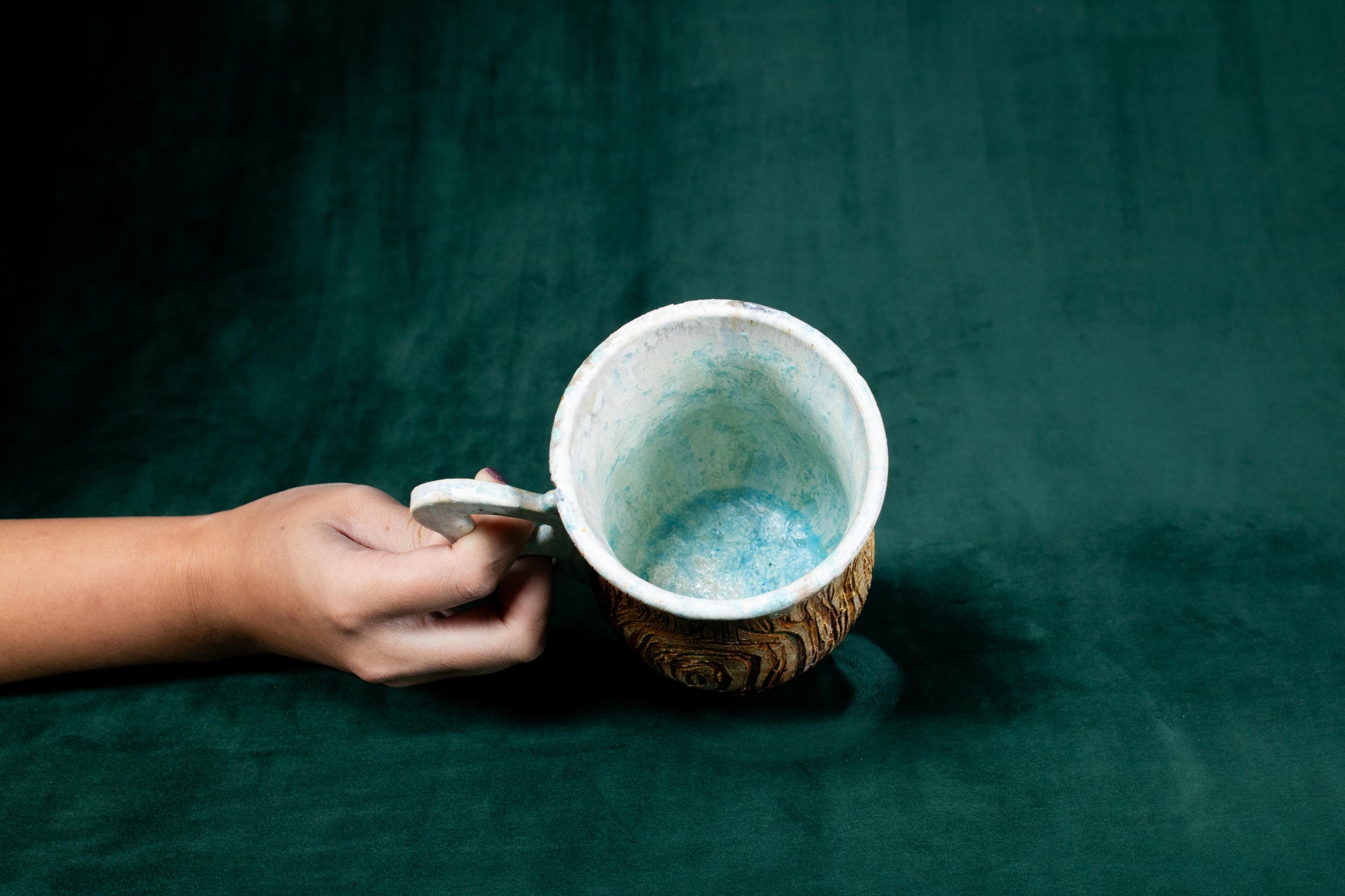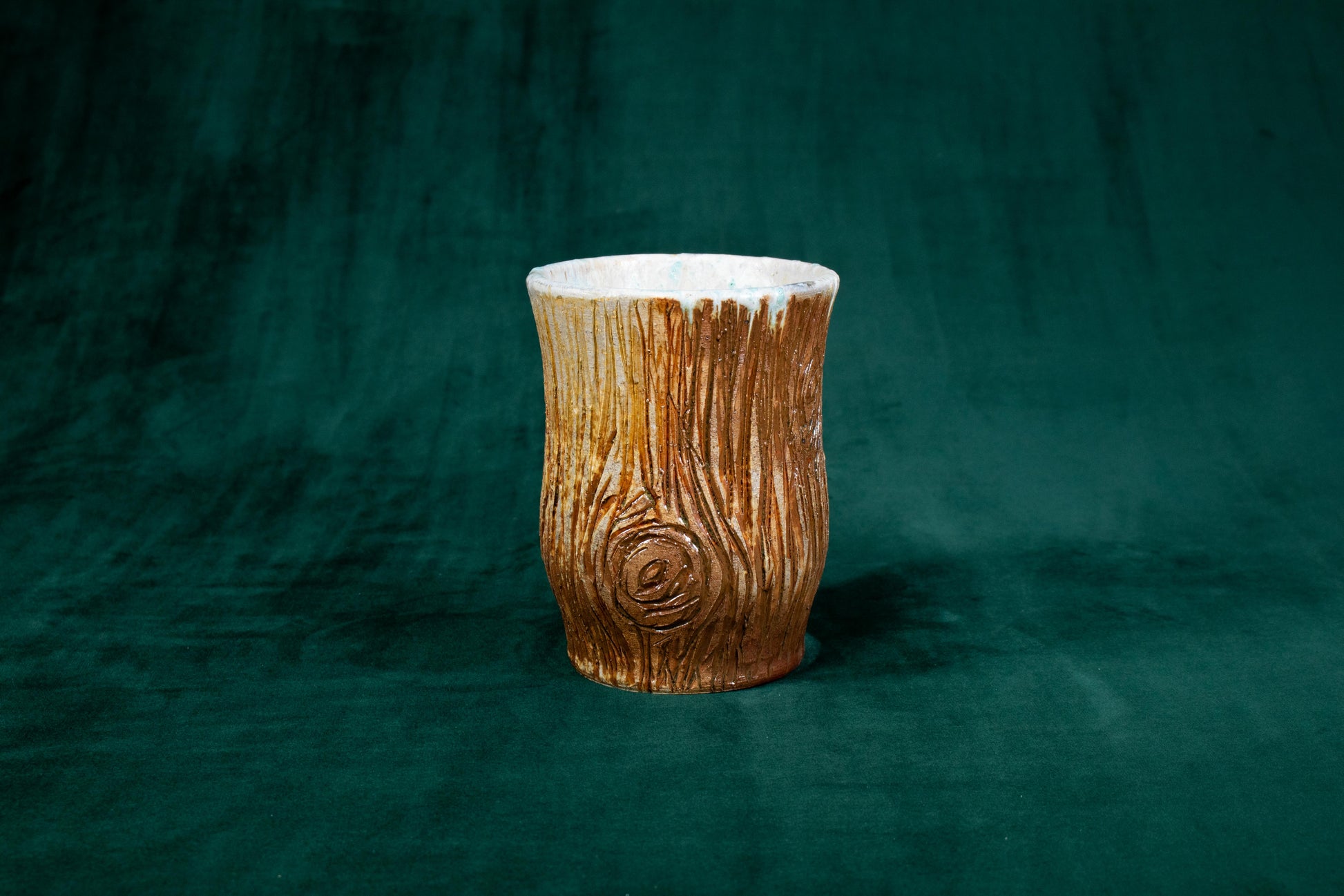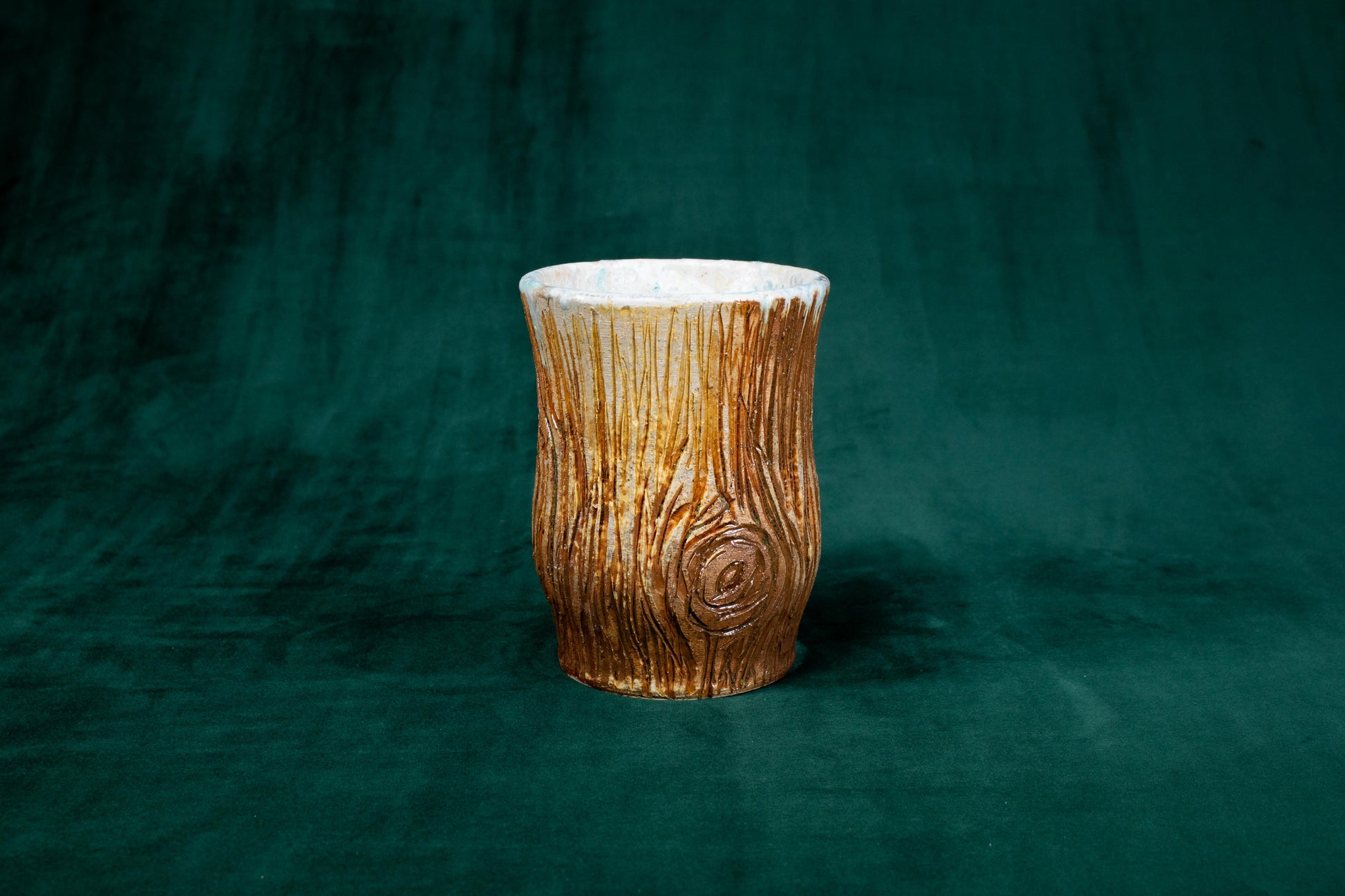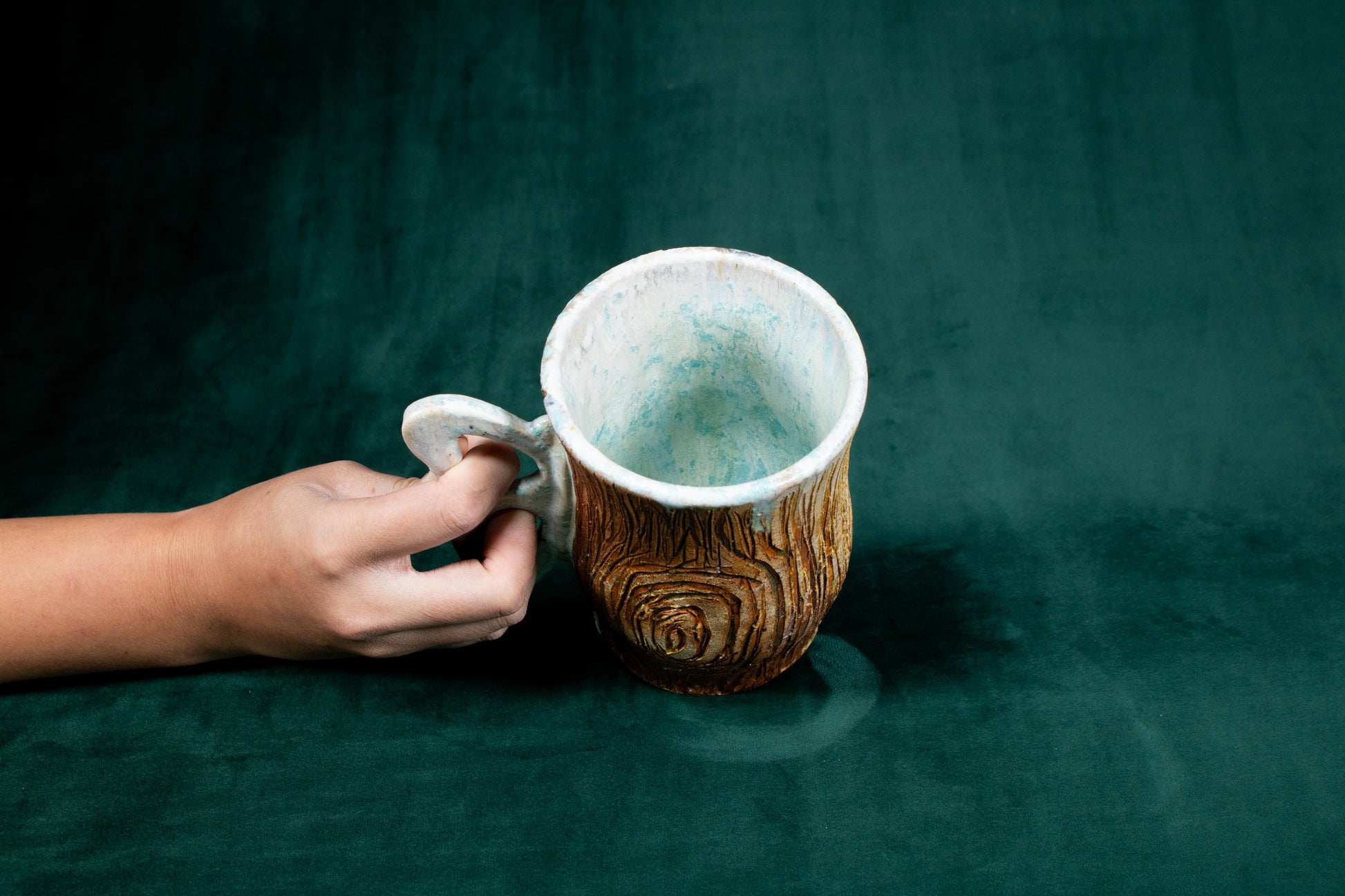 This mug was thrown on a wheel, trimmed, carved, sculpted, fired in a kiln, hand glazed for gloss, and fired in a wood fire kiln for 45 hours to 2300°F for final product.