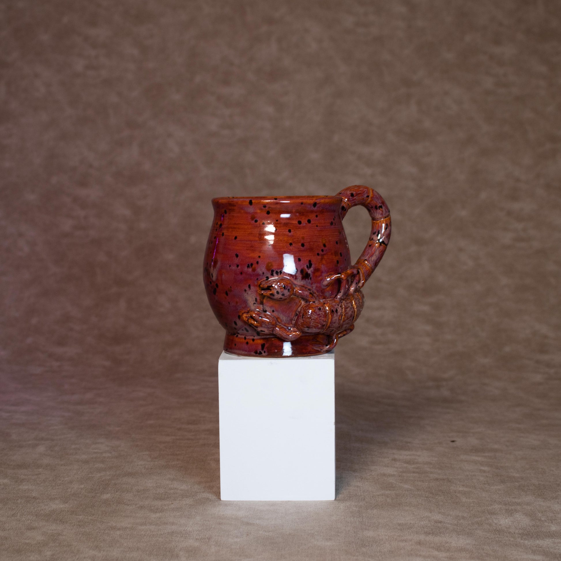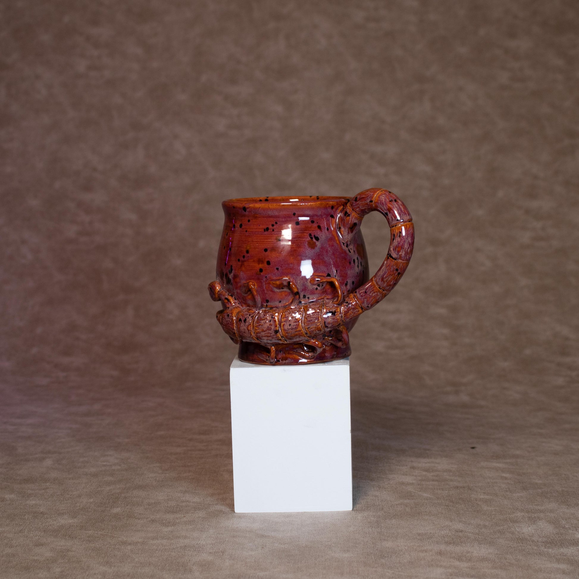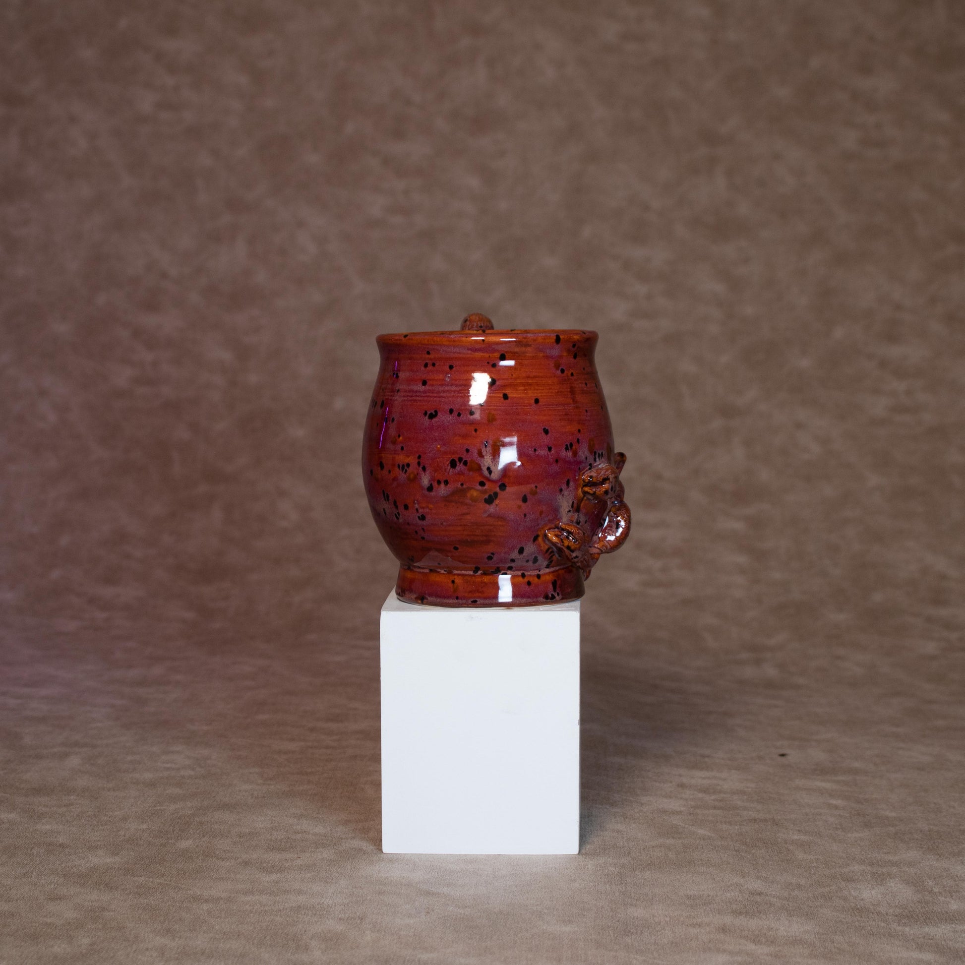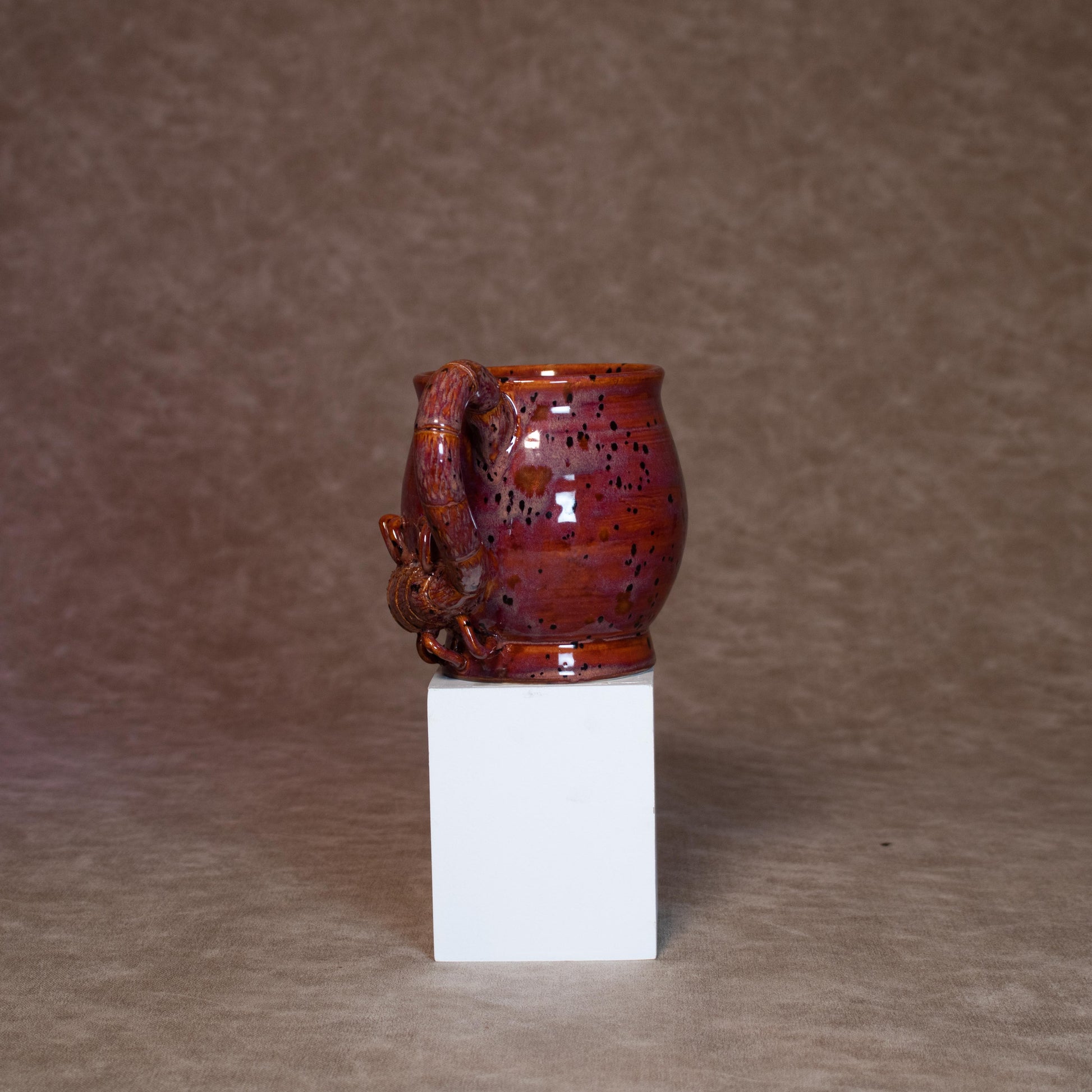 This mug was thrown on a wheel, trimmed, carved, sculpted, and hand painted, fired in a kiln, hand glazed for gloss, and fired once again for final product.
