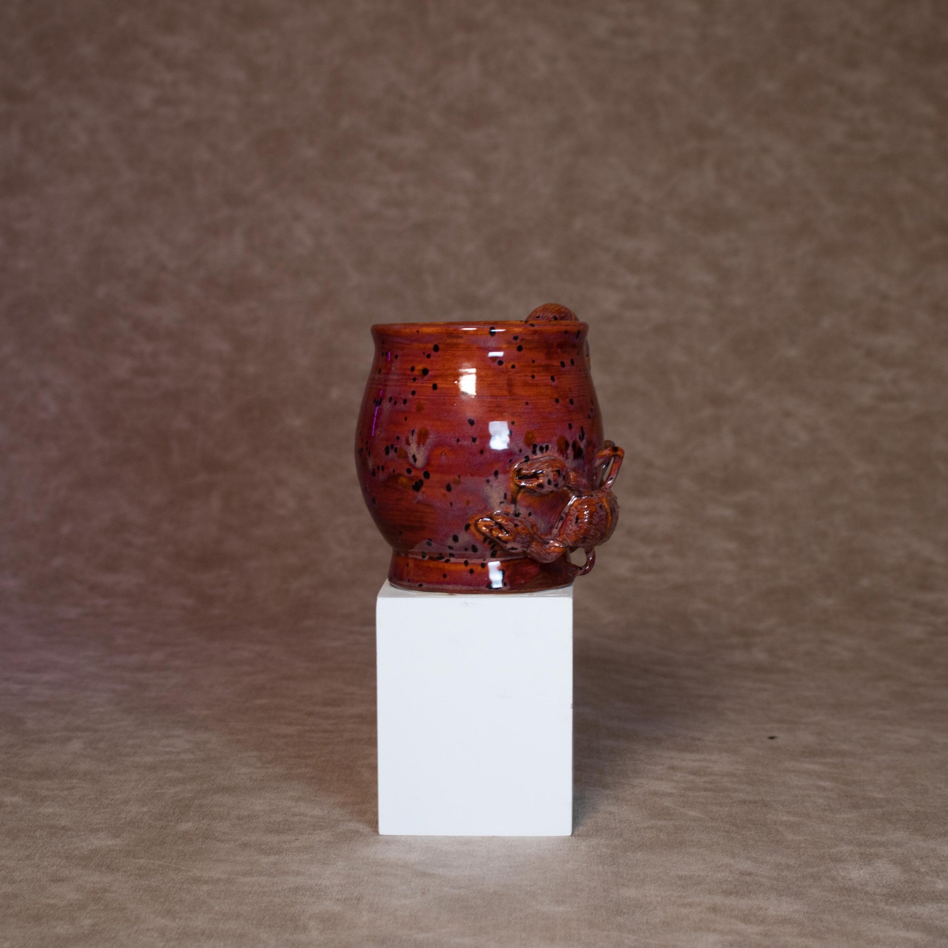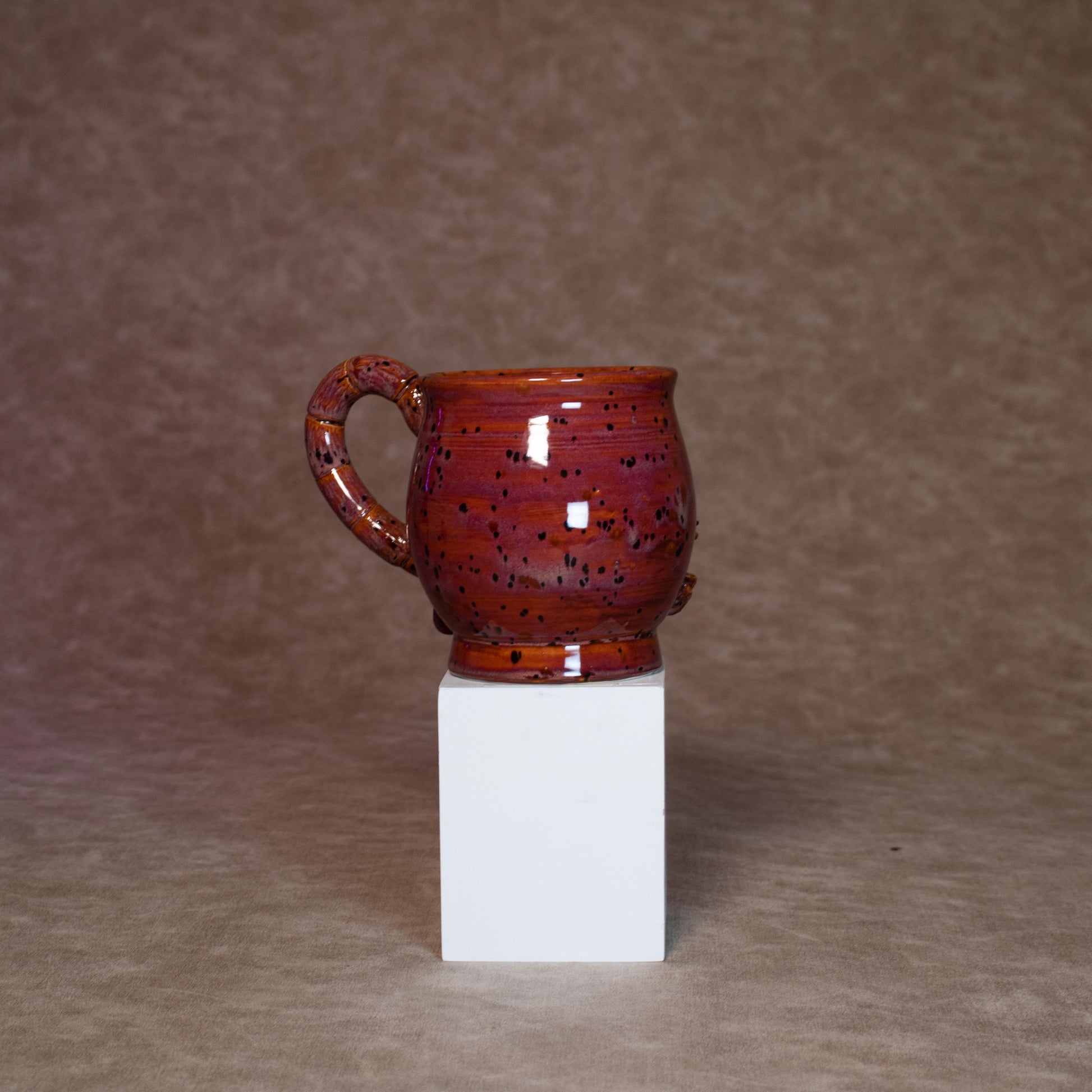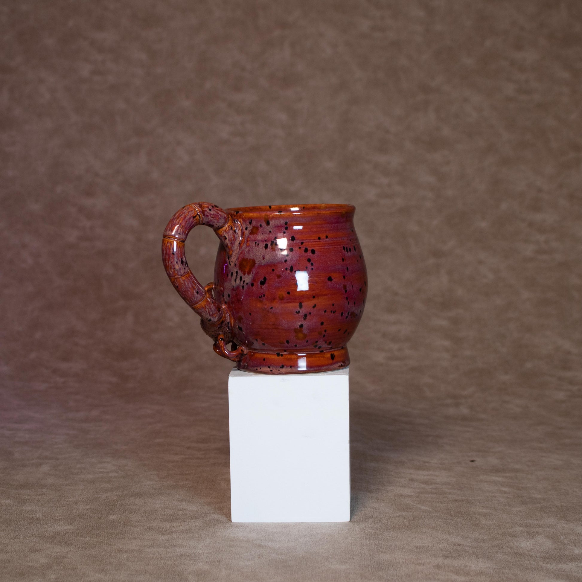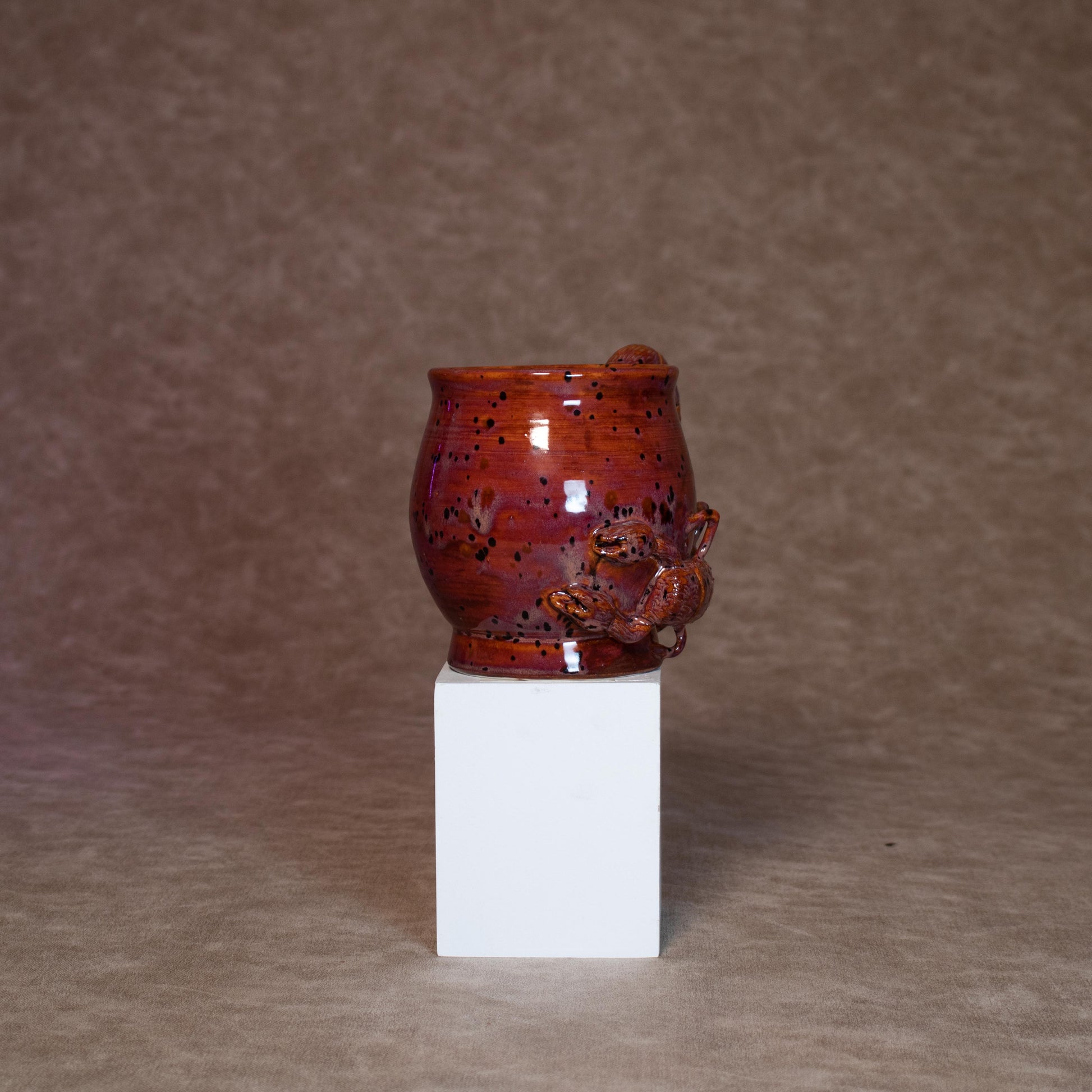 This mug was thrown on a wheel, trimmed, carved, sculpted, and hand painted, fired in a kiln, hand glazed for gloss, and fired once again for final product.