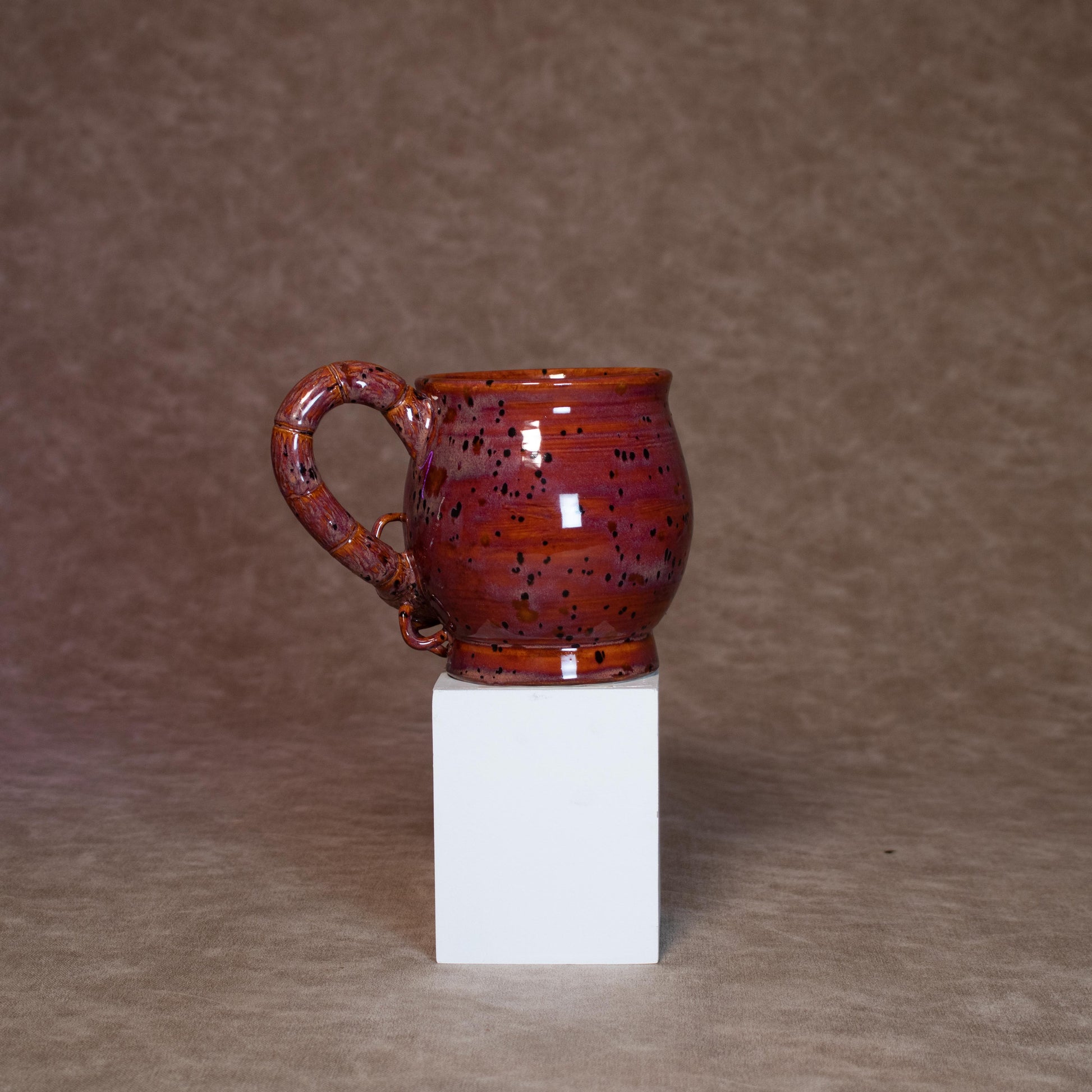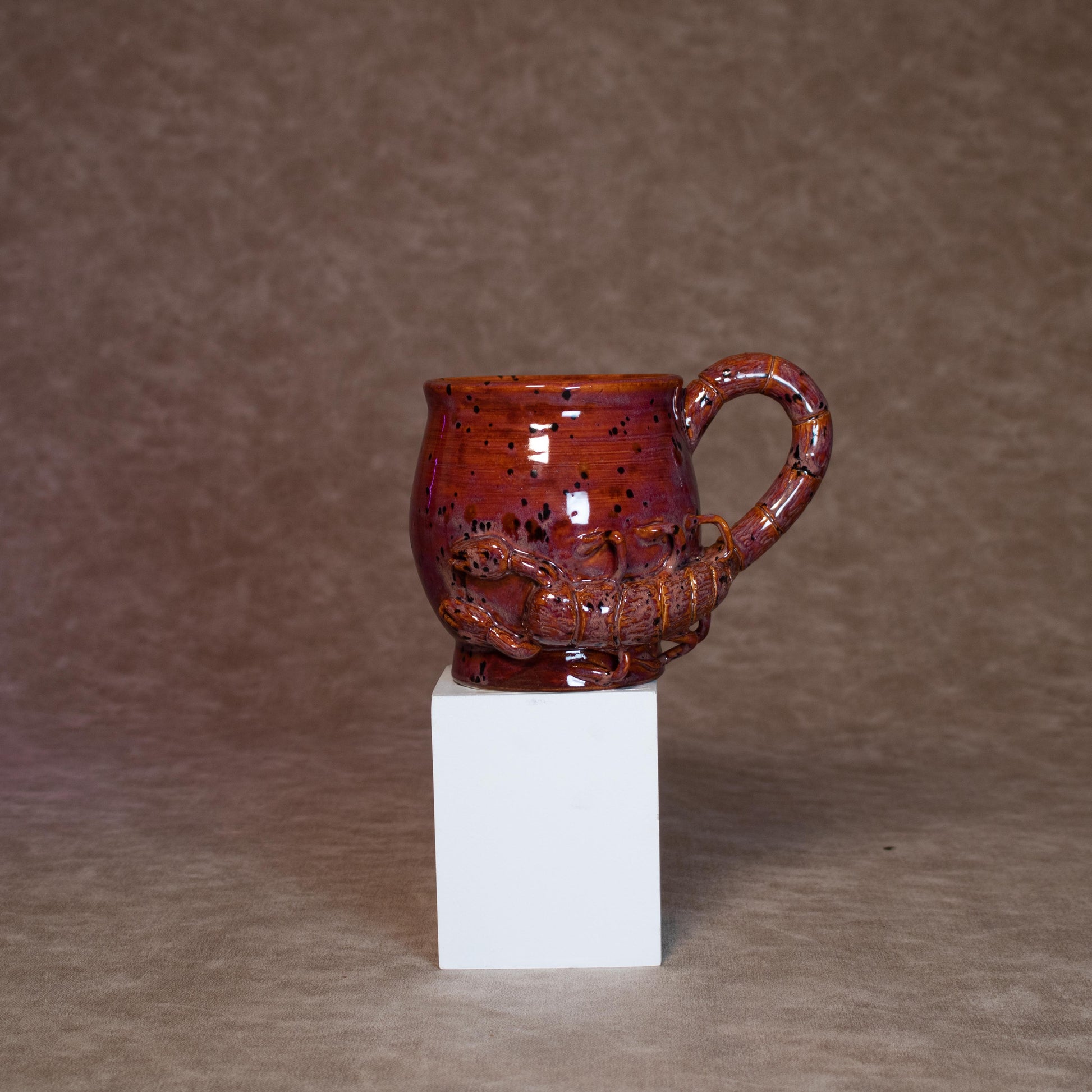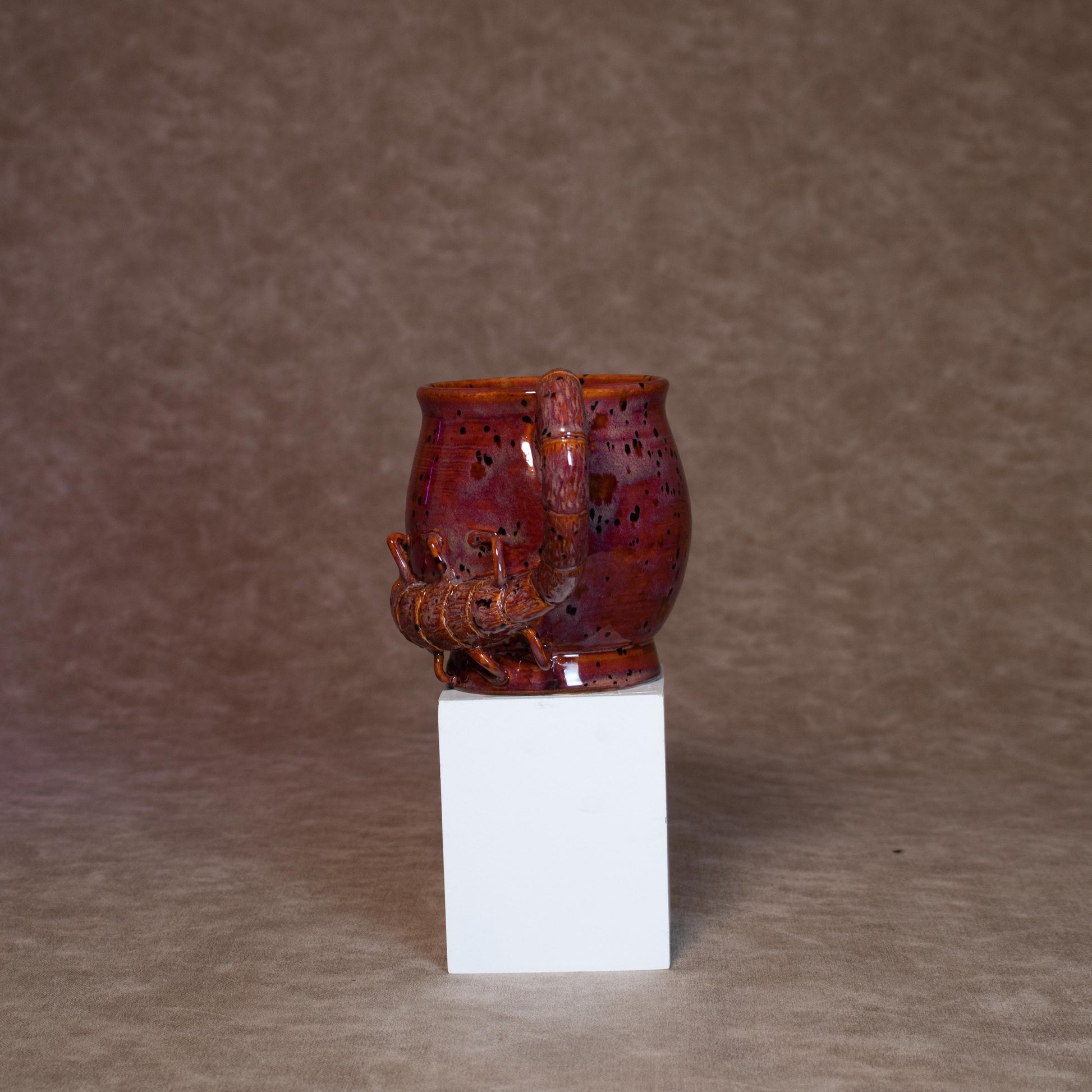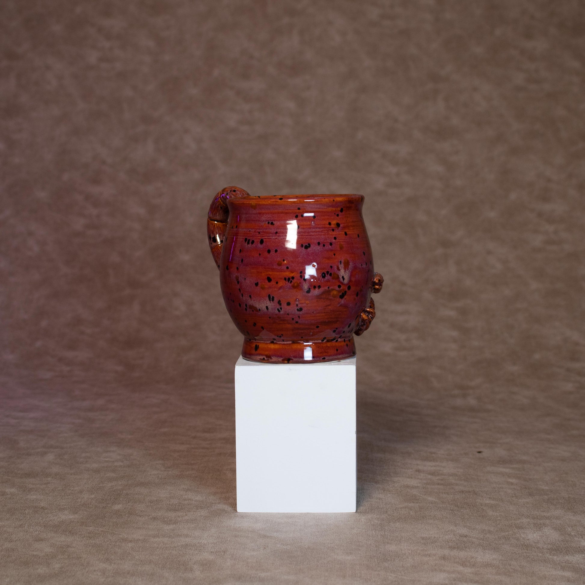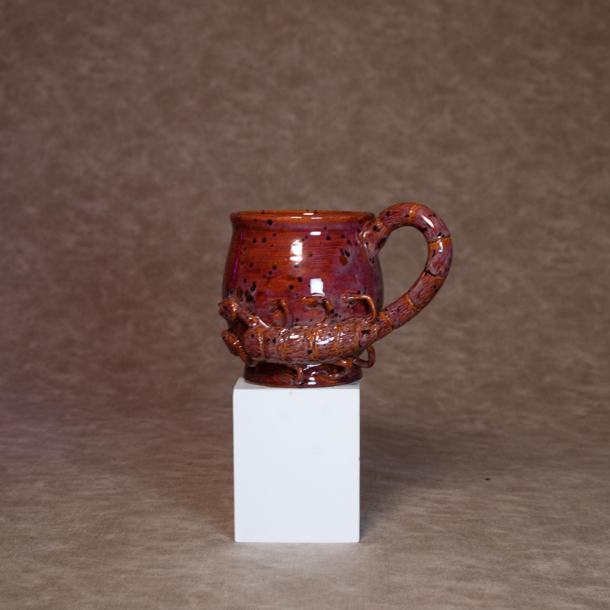 This mug was thrown on a wheel, trimmed, carved, sculpted, and hand painted, fired in a kiln, hand glazed for gloss, and fired once again for final product.