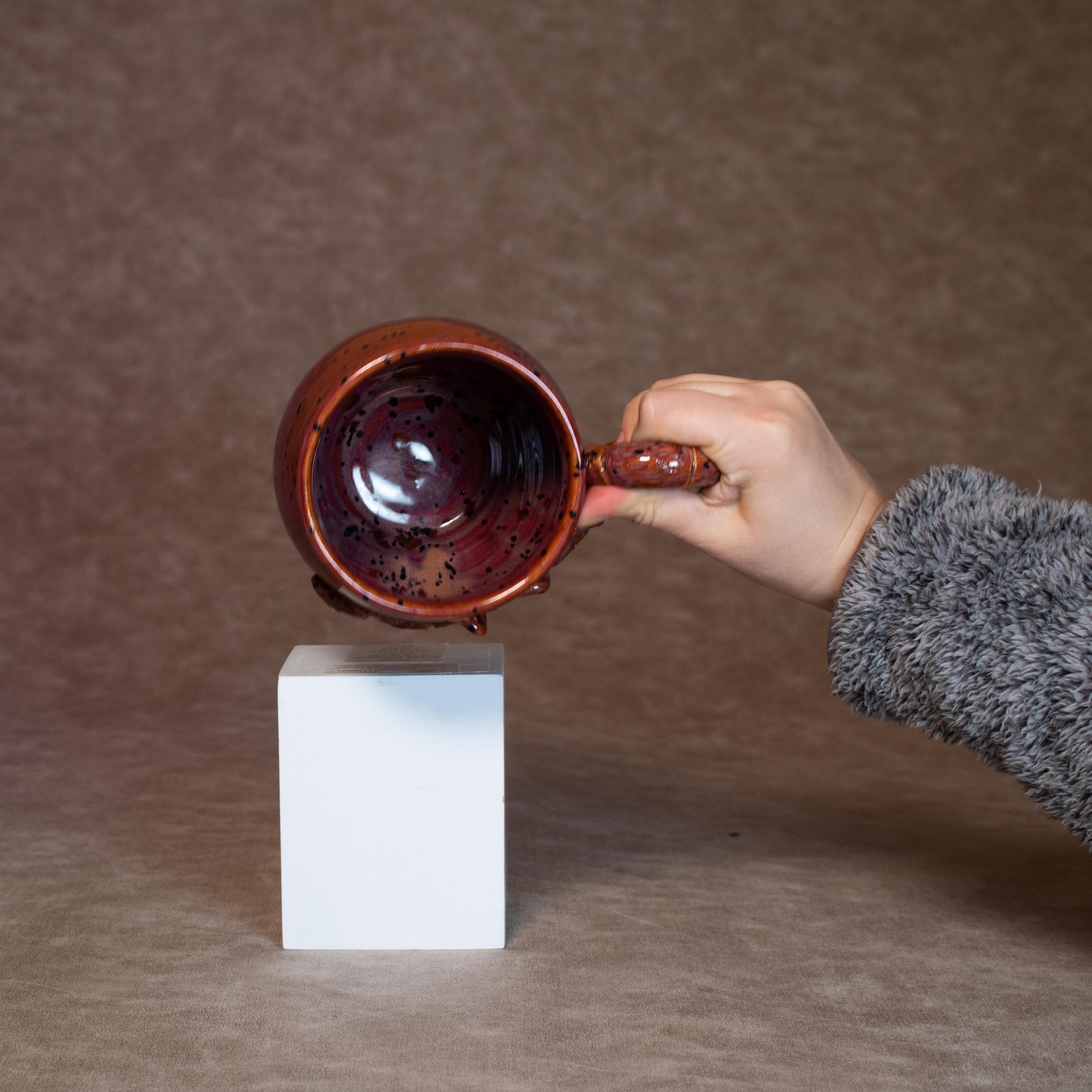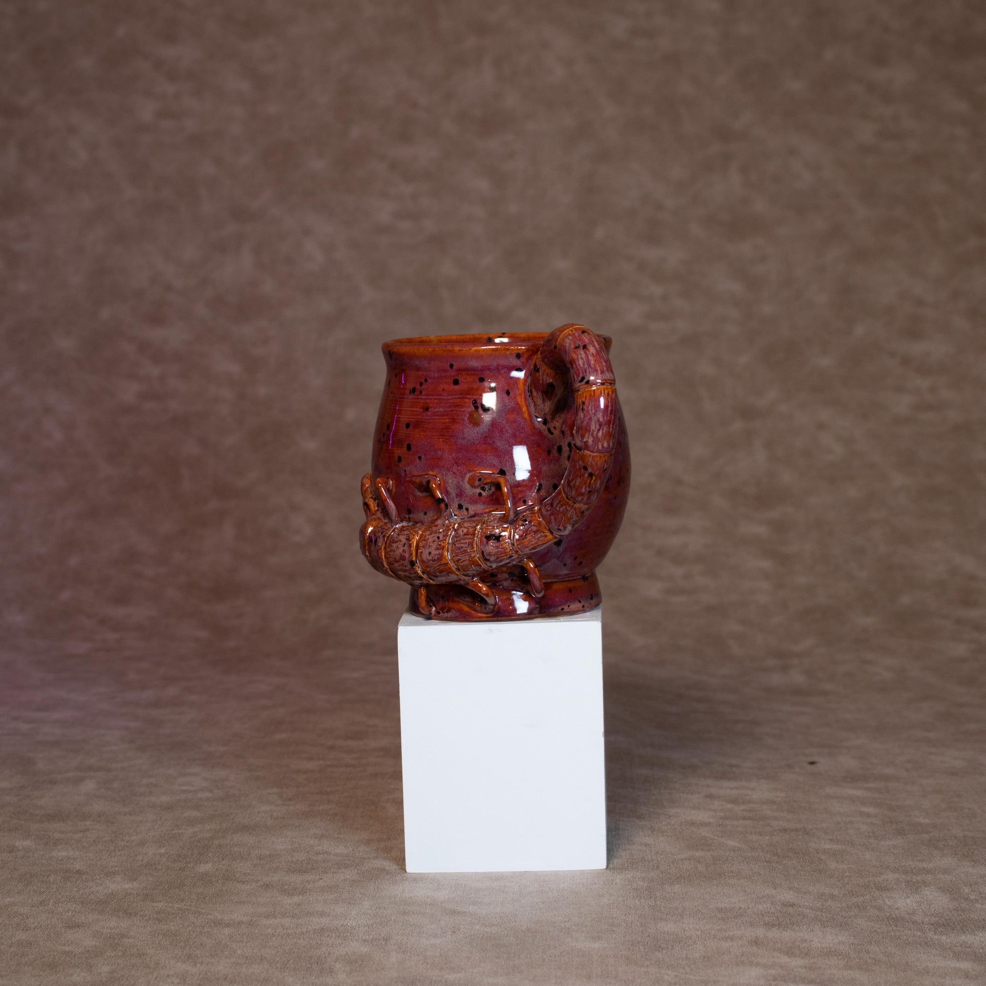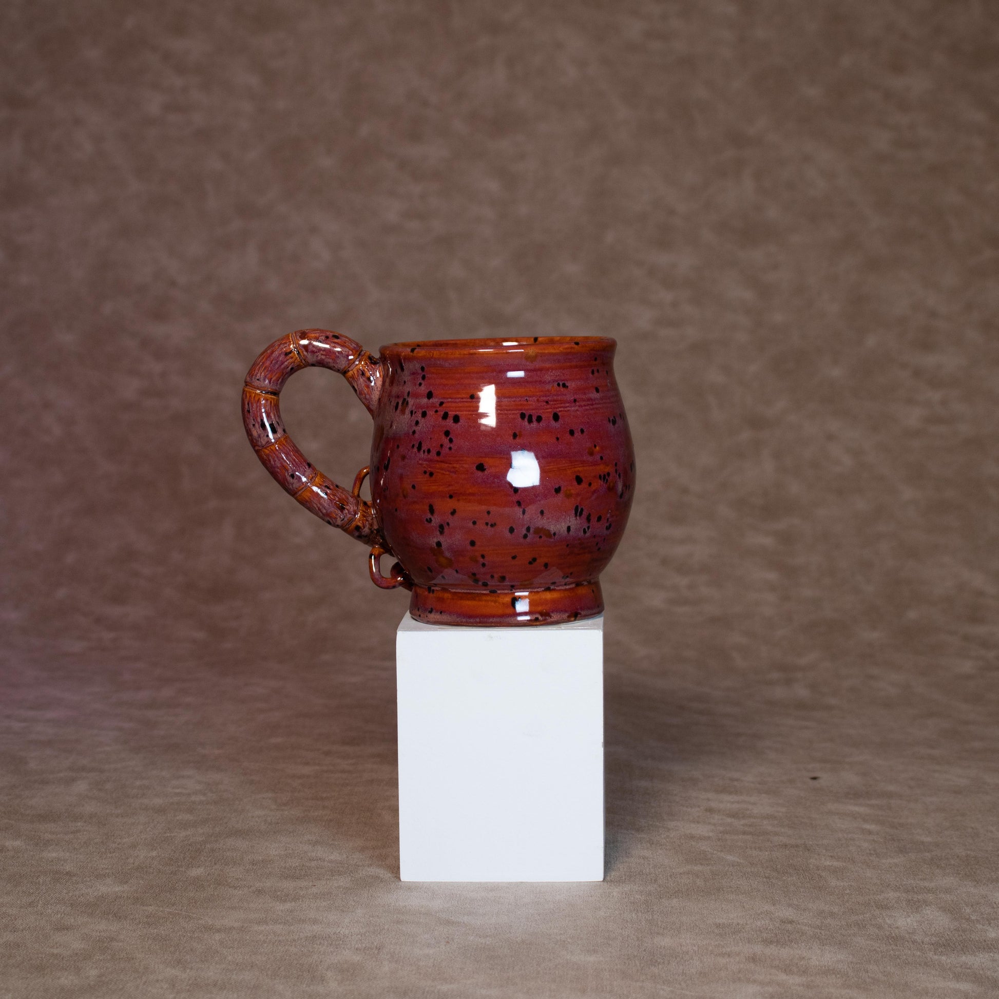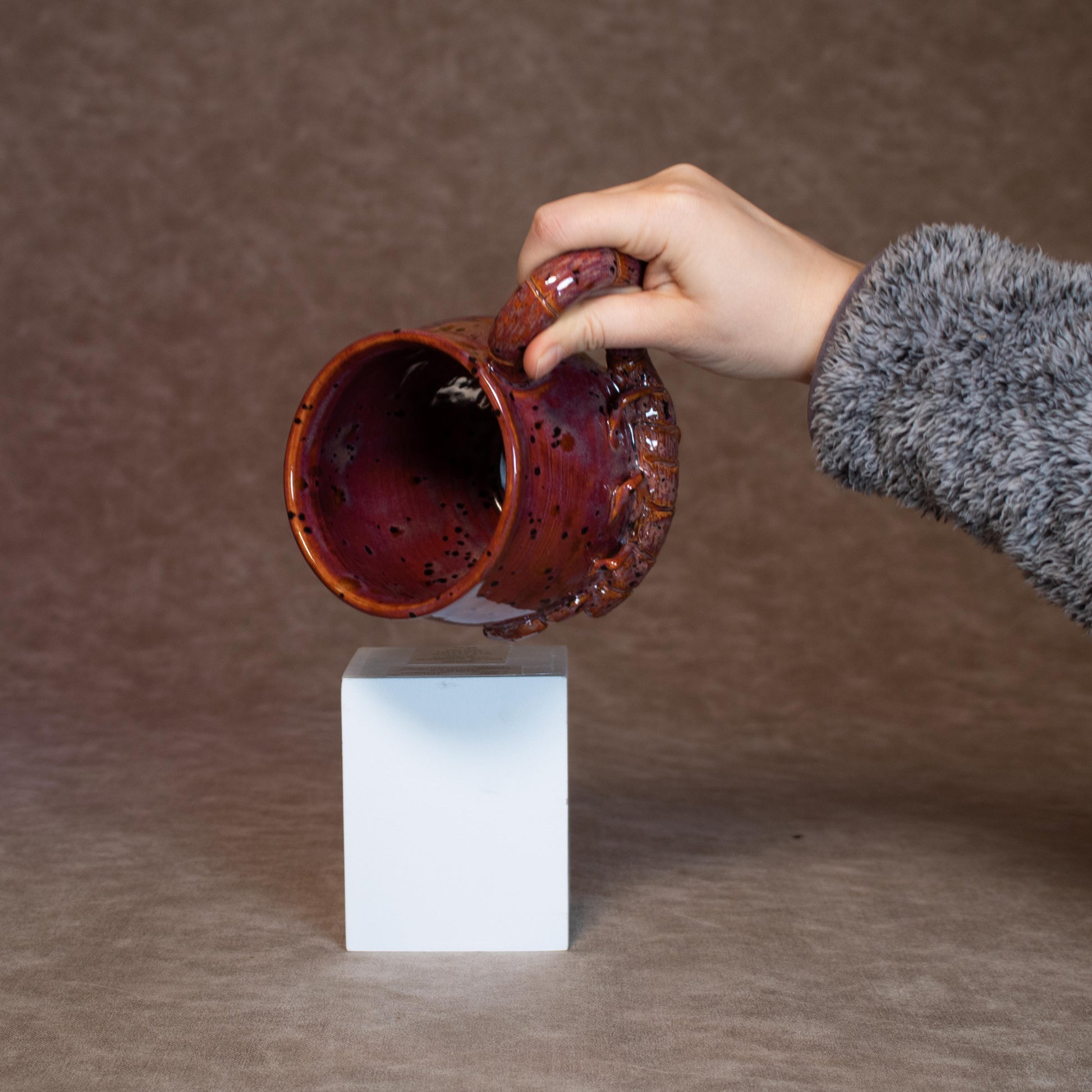 This mug was thrown on a wheel, trimmed, carved, sculpted, and hand painted, fired in a kiln, hand glazed for gloss, and fired once again for final product.